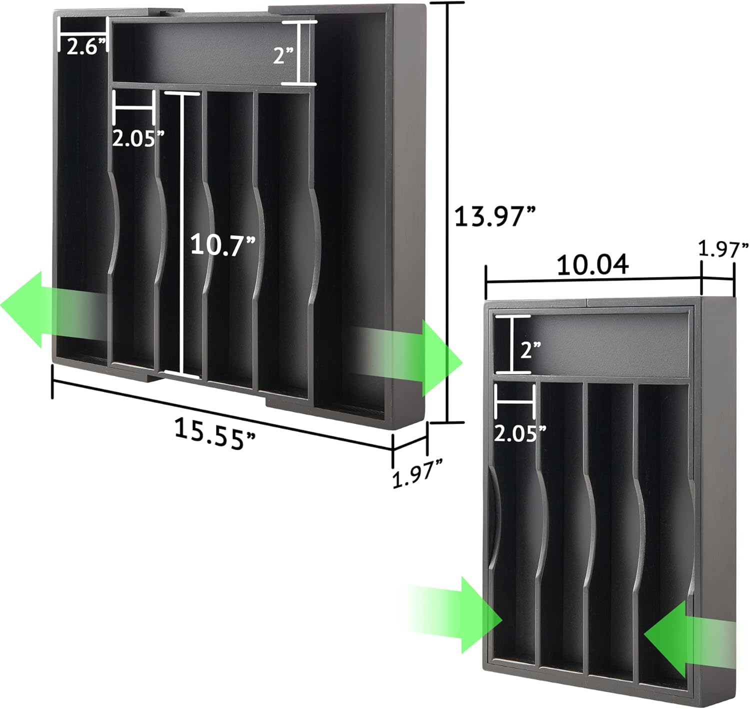 - [TWO-PIECE SET]: This 2-Piece 10.04" - 15.5" wide, 13.98" long and 1.97" deep bamboo drawer organizer can tame your out-of-control kitchen drawers, to store and organize the cutlery and kitchen utensils according to your rules, and maximize the drawer storage. Keep everything accessible and organized, so that you don't have to rifle around for your cooking tools. Beautiful and practical kitchen drawer organizer turns the cooking and tasting into things of beauty and efficiency.