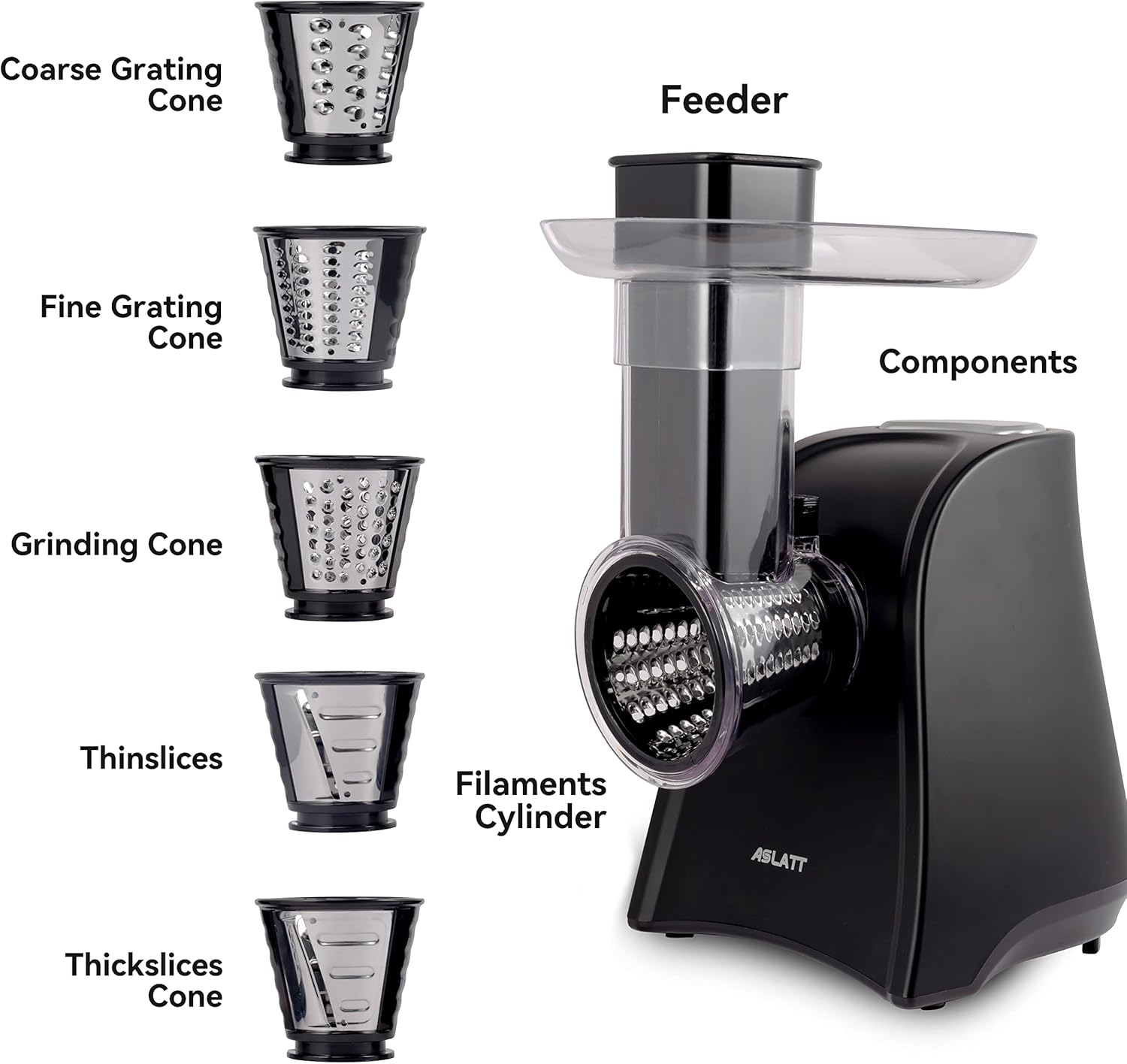 Electric Slicer, Electric Cheese Grater for Home Kitchen Use, One-Touch Control Cheese Shredder, Salad Maker Machine for Fruits, Vegetables, Cheese Grater with 5 Attachments