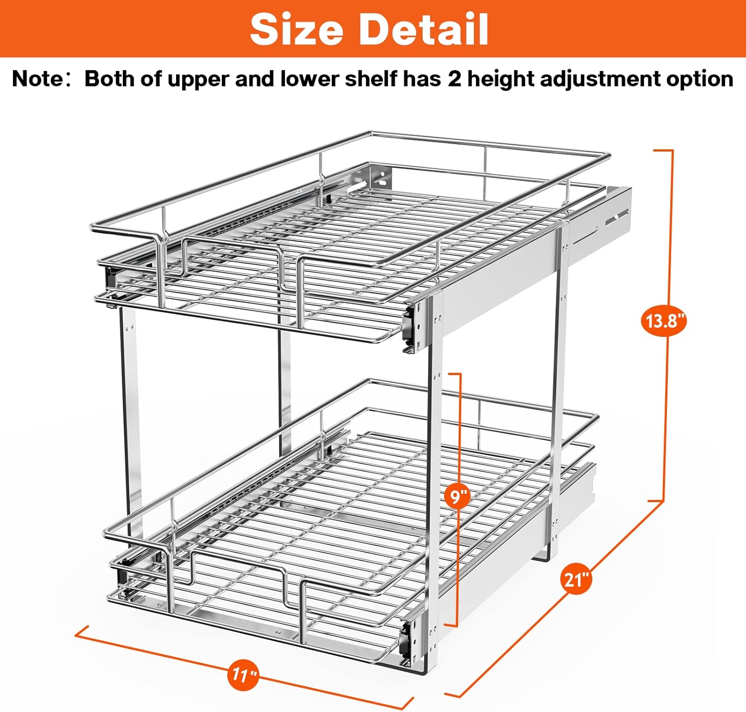 - 【Space-saving Pull Out Cabinet Organizer】This slide out cabinet organizer can maximize your cabinet space. Makes it super easy to store, organize, and access your stand mixers, pots, pans, baking sheets and other kitchen accessories, cleaning supplies, and various odds and ends. Now your cabinet is no longer just stacks of potspans.
