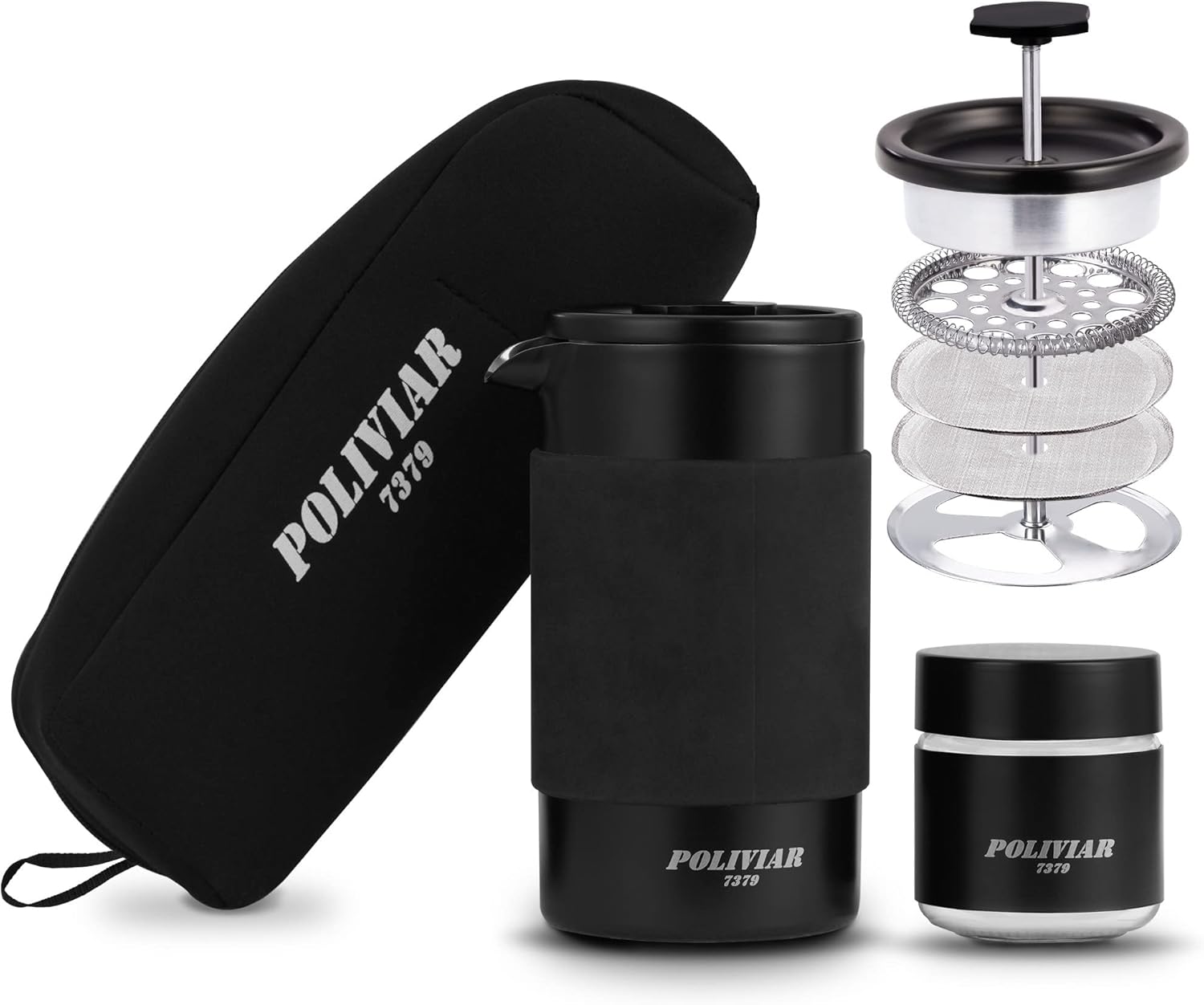 POLIVIAR French Press Coffee Maker, 12 oz Portable French Press with Mini Canister and Collection Bag, Double Wall Insulation & Dual- Filter Screen, Food Grade Stainless Steel for Coffee