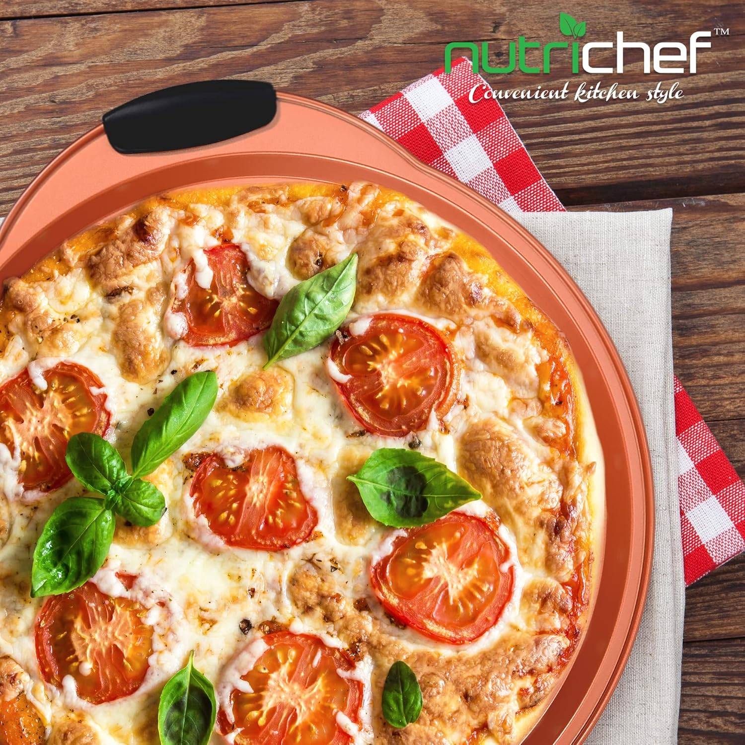 NutriChef 13-Inch Nonstick Pizza Tray - Round Carbon Steel Non-Stick Pizza Baking Pan with Perforated Holes, Premium Bakeware Pizza Screen with Silicone Grip Handles, Dishwasher Safe - Copper