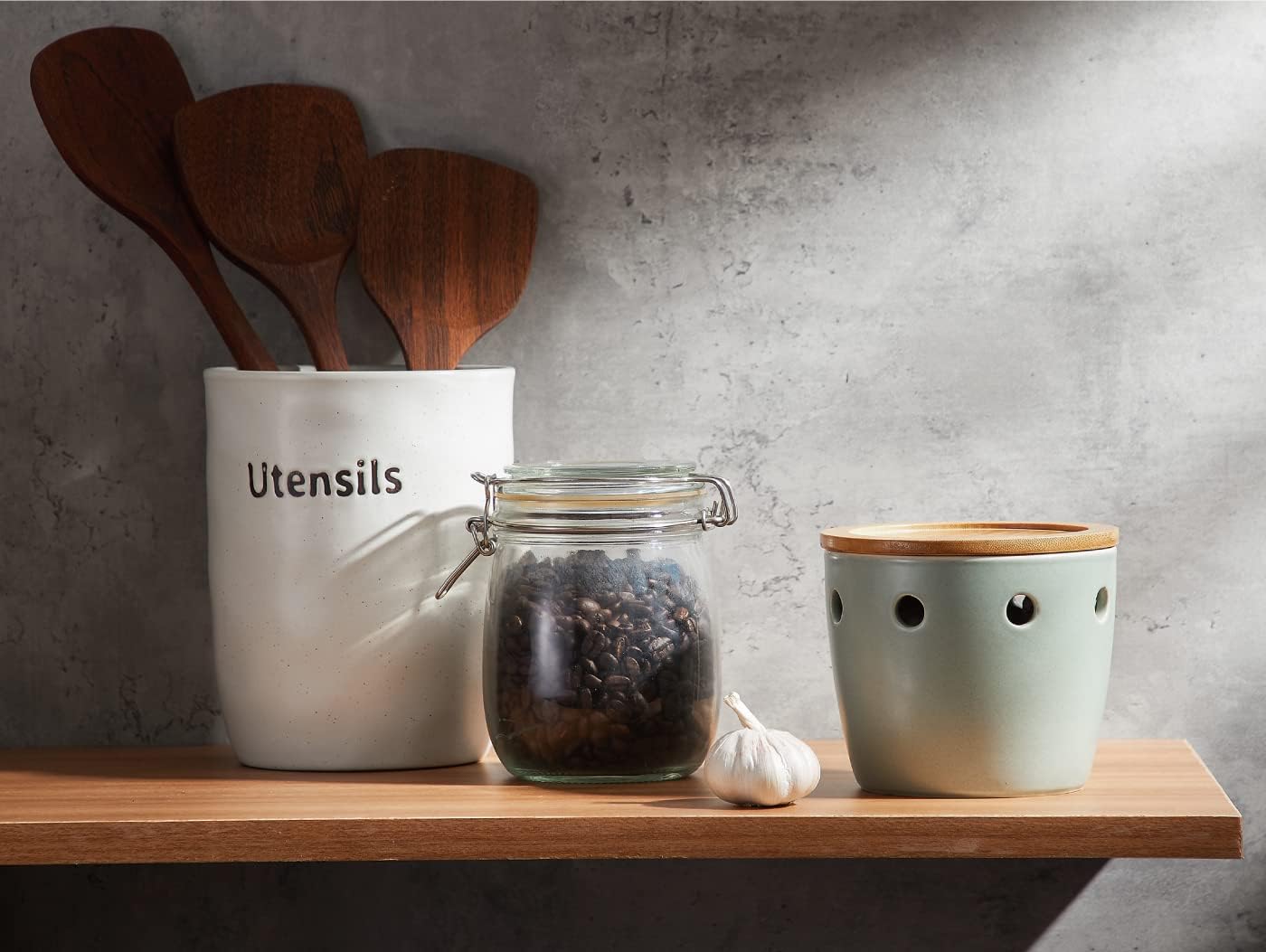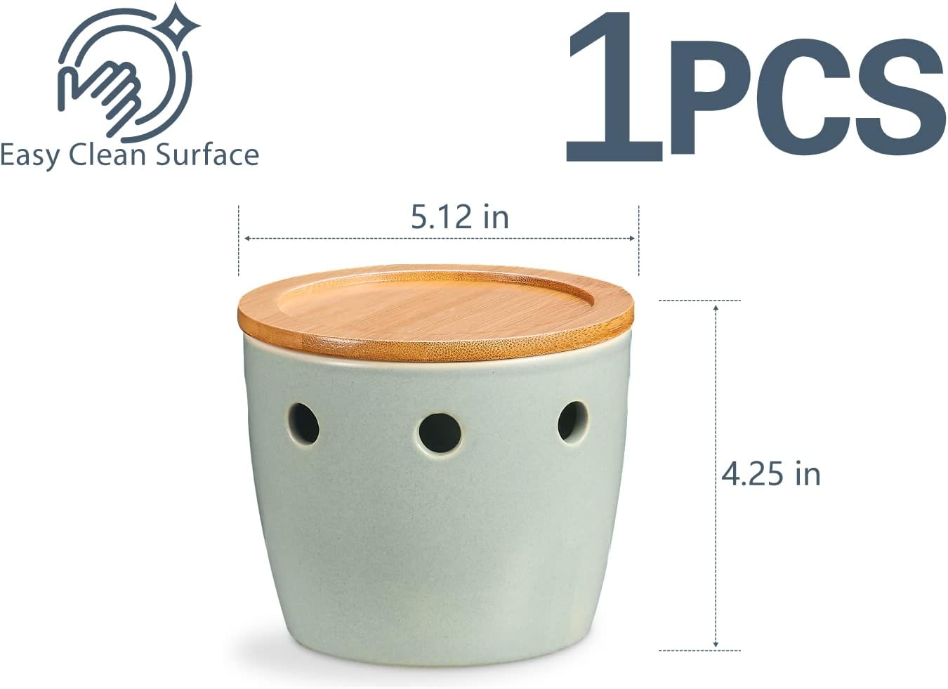 ONEMORE Large Garlic Keeper with Lid, Ceramic Garlic Saver 5 inch, Garlic Keeper for Counter, Light Green