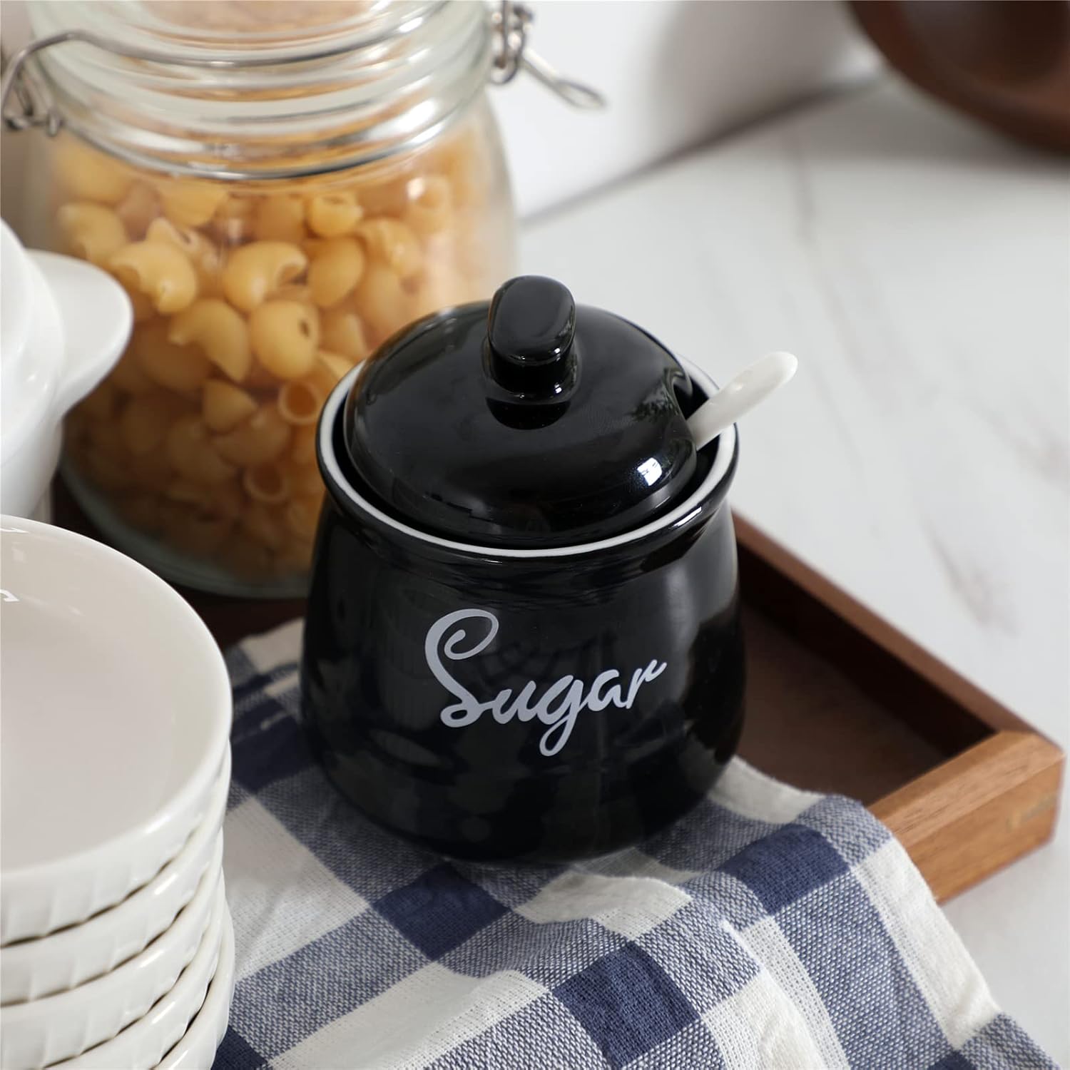 - PERFECT COMBINATION: This sugar bowl is equipped with a perfect lid and a small spoon. The lid can keep your ingredients away from dust. There is a perfect notch on the lid for placing the spoon, so you donβt have to worry about placing the spoon randomly