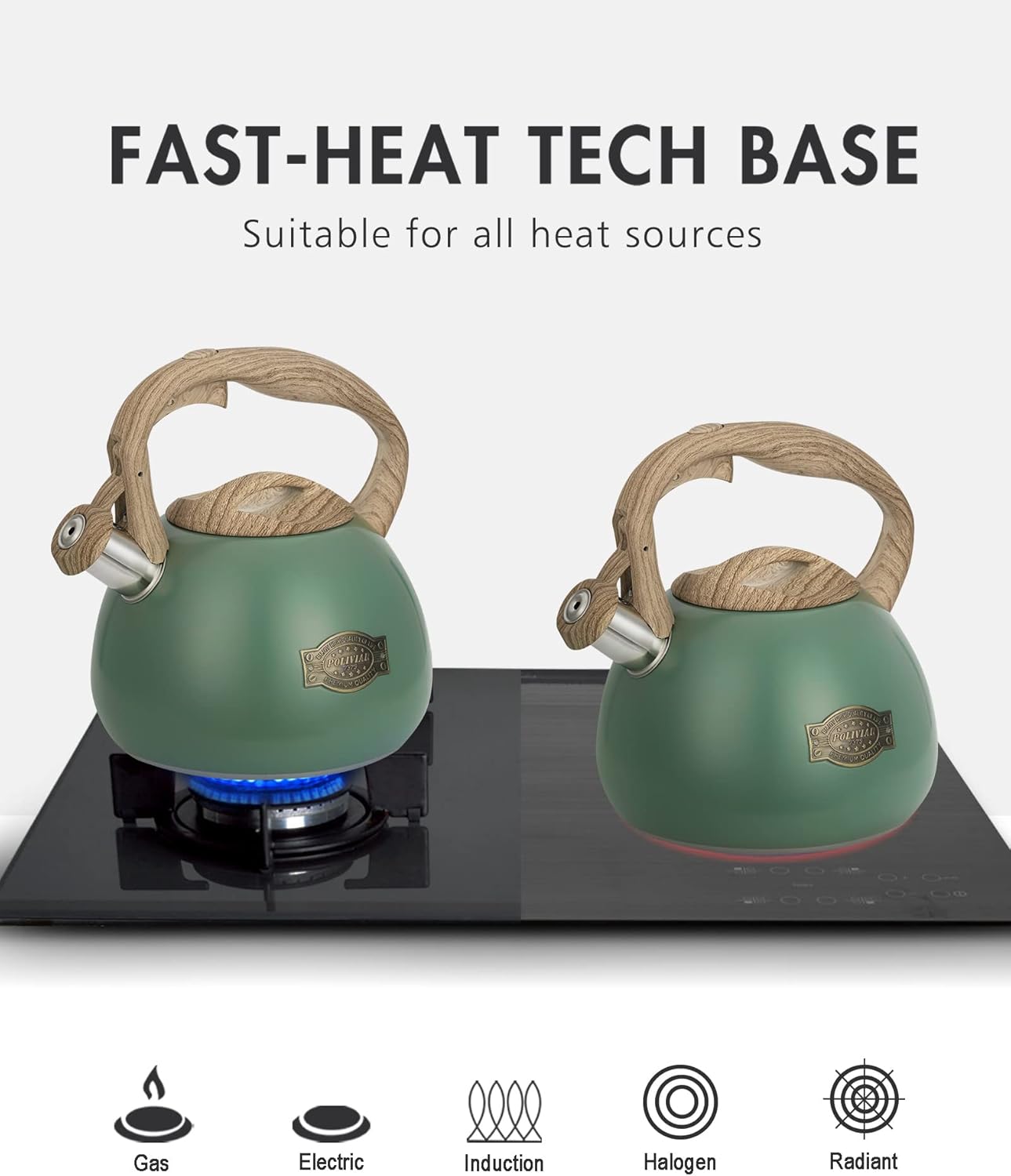 - Fast Heat Base: The tea kettle designed with a generous 8 in base can maximize the heat conduction to increase the efficiency of boiling. High grade stainless steel is suitable for any heat source including gas, electric and induction.