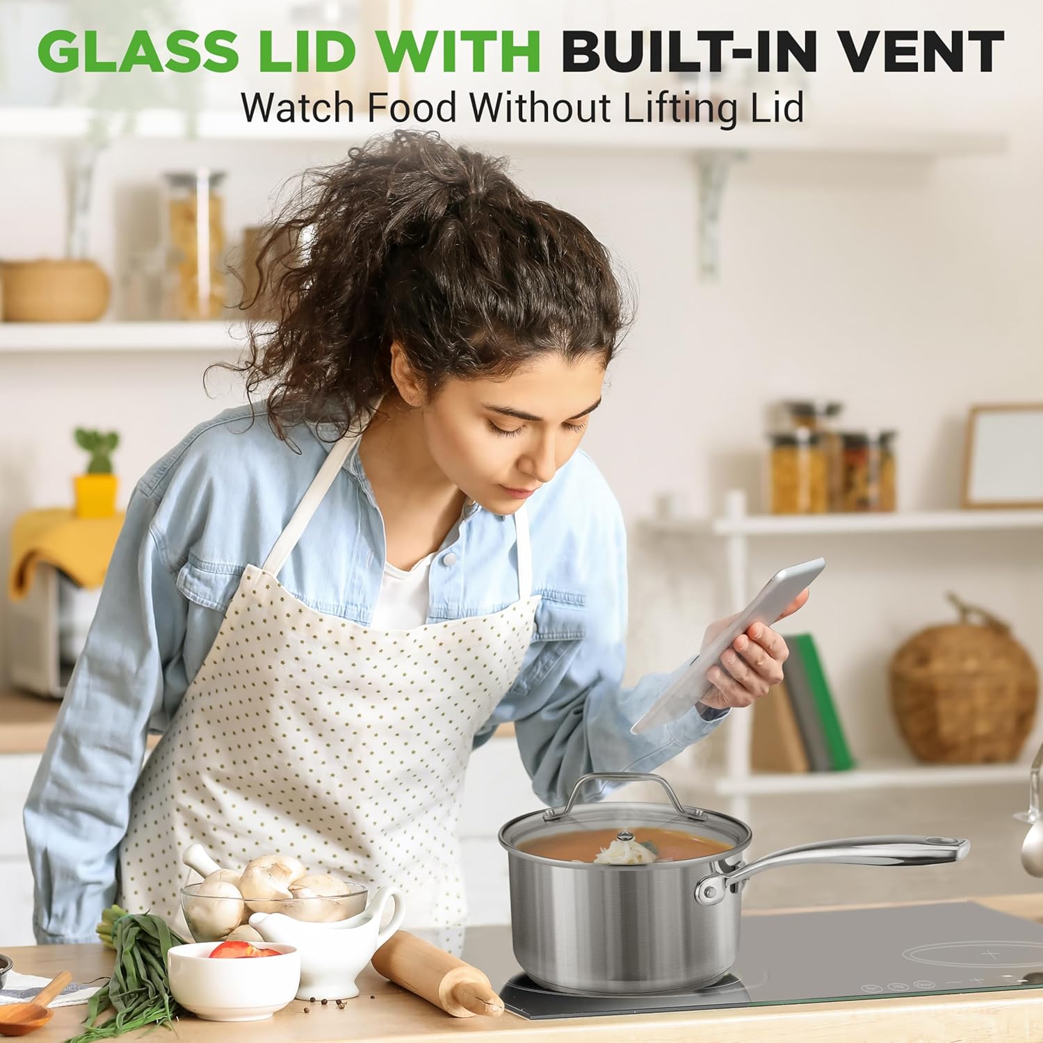 - SEE-THROUGH LID: This sauce pot for cooking is equipped w/ see-through tempered glass lid w/ vent hole that allows steam to escape. It effectively distributes & retains heat for even cooking w/ 500° F max temperature except glass lid