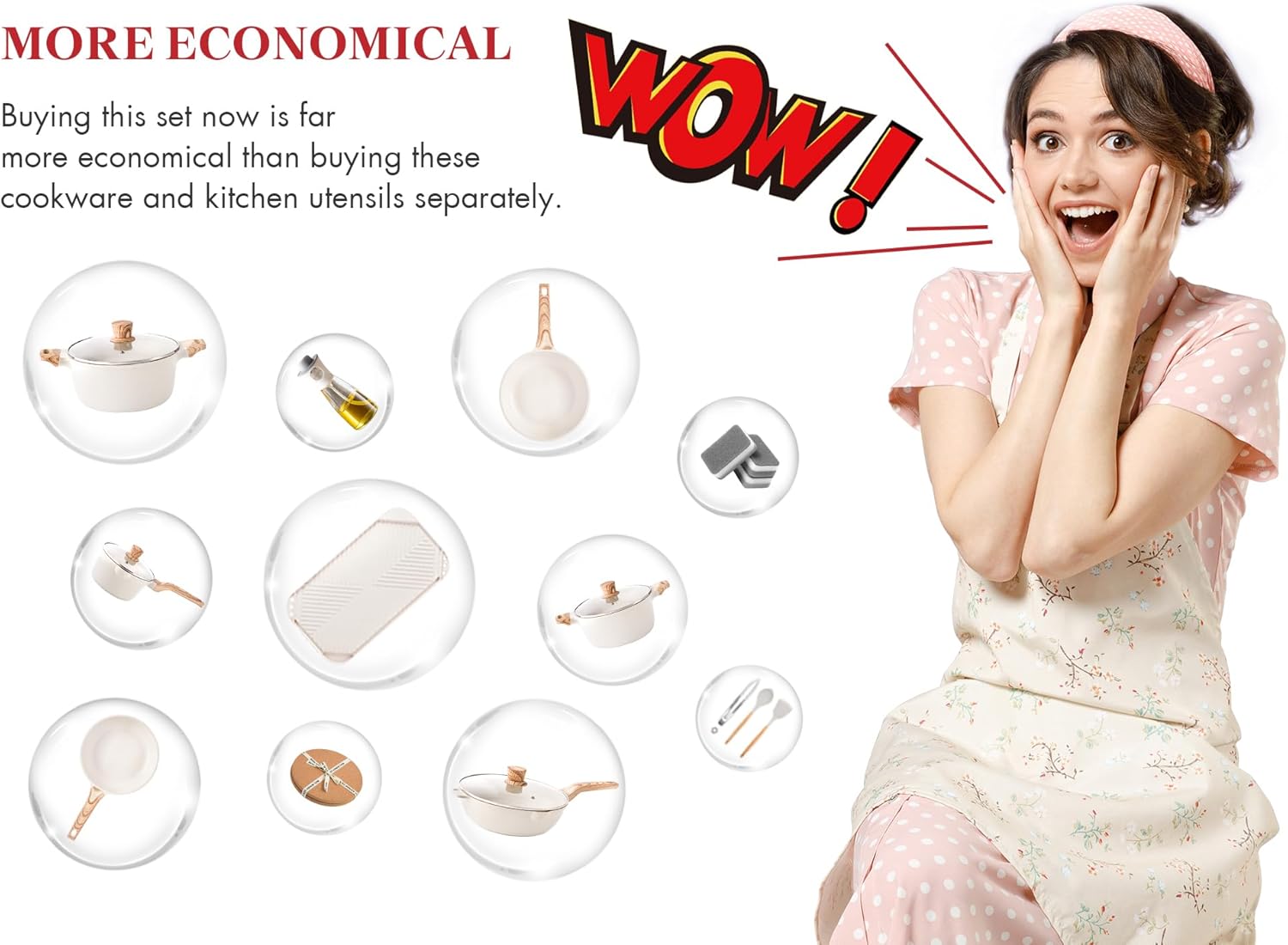 Caannasweis 20Pcs Cookware Sets, Nonstick Pots and Pans Set, Granite Induction Cookware, Non Stick Kitchen Cooking Set, Grayish White Grill Griddle Set, PFOS PFOA Free