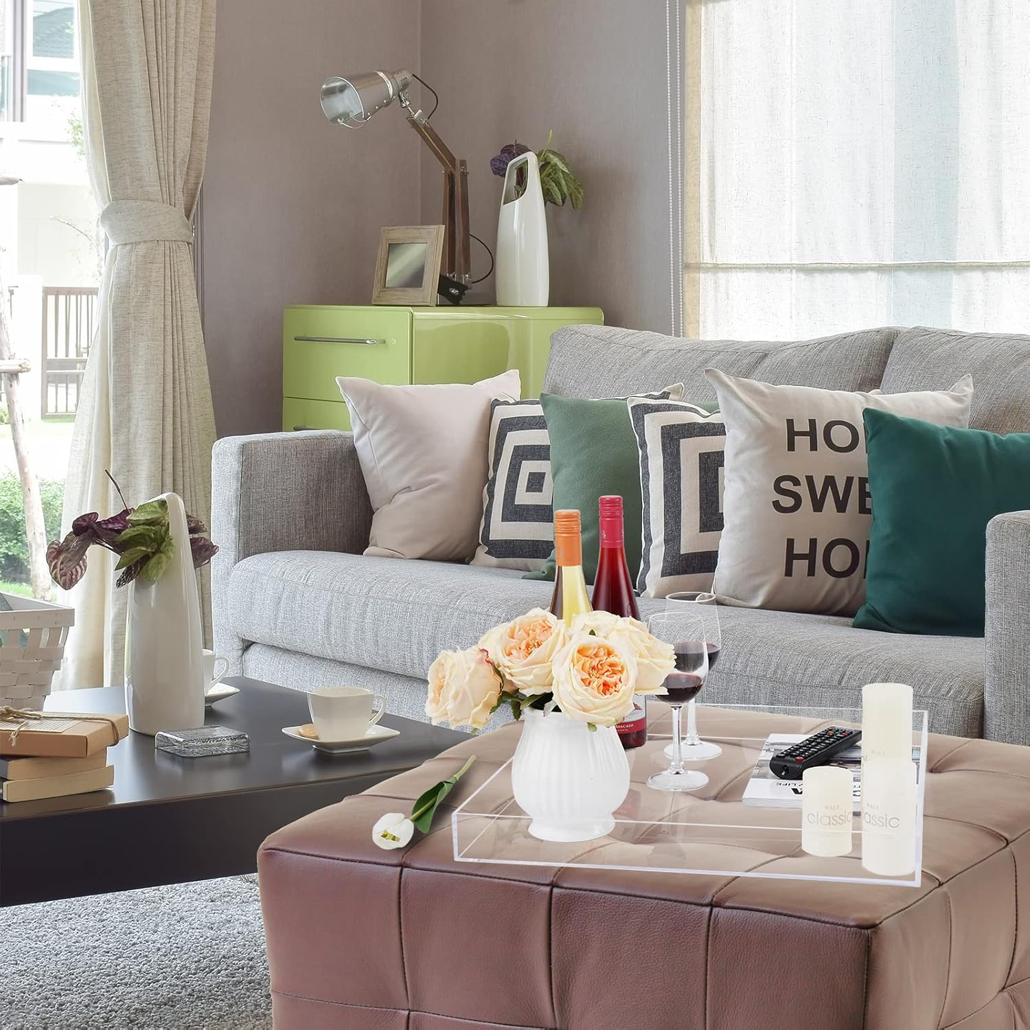 - Material: Our serving trays with handles are made of glossy white acrylic, Which is high quality and sturdy, The acrylic is a environment friendly material, Our square extra large acrylic trays are perfect ottoman trays for living room
