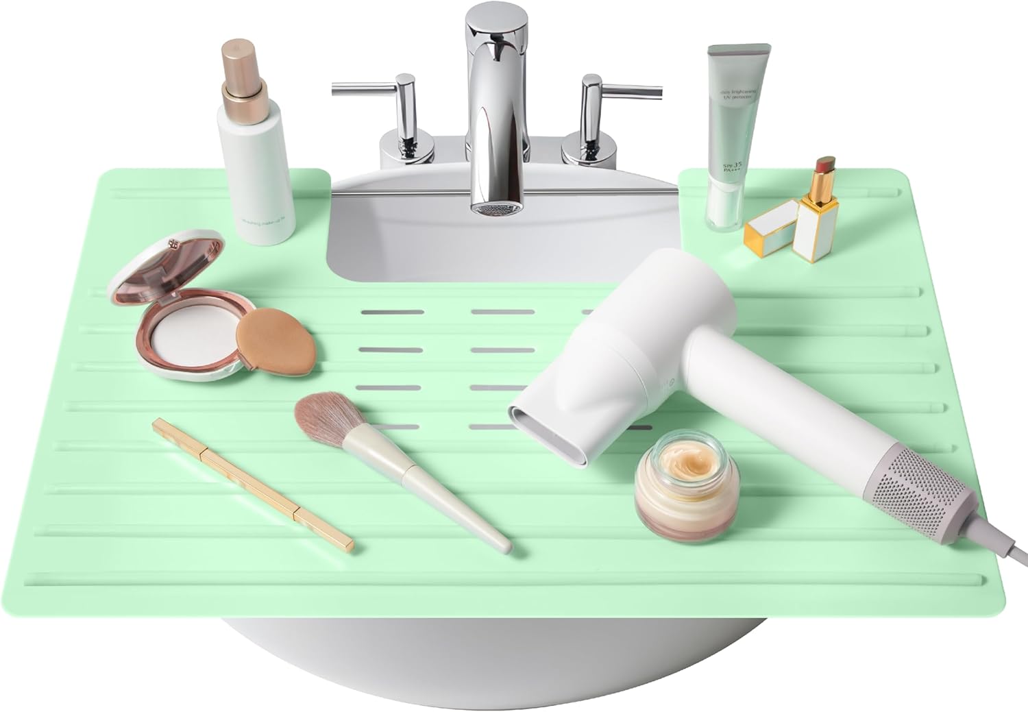 Maplefield Silicone Over-the-Sink Makeup Mat - Mint 22 x 2 x 2 In - Heat-Resistant up to 400°F - Foldable Sink Cover for Counter Space - Travel-Friendly Vanity Topper