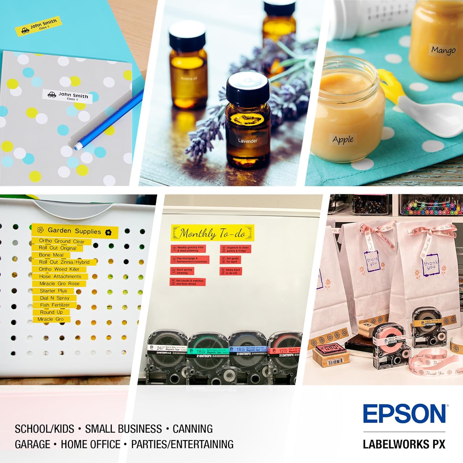 - TAPE VARIETIES - Epson LABELWORKS PX label tapes offer a wide range of options to suit home and crafting needs, including matte, metallic, gold imprint, pearl, ribbons, and more! Unleash your creativity with labels up to 3/4" (18mm) wide—perfect for crafting projects, organizing your home or office, and adding a personal touch to gift wrapping.