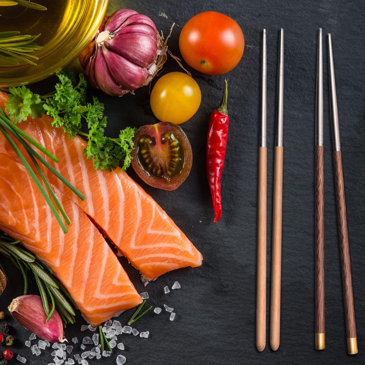 - Elegant wood and practical metal combined. The part of the hand grip is wood, which is more comfortable in contact with the skin. The tip of the chopsticks is 304 stainless steel, safe to touch food and easy to clean