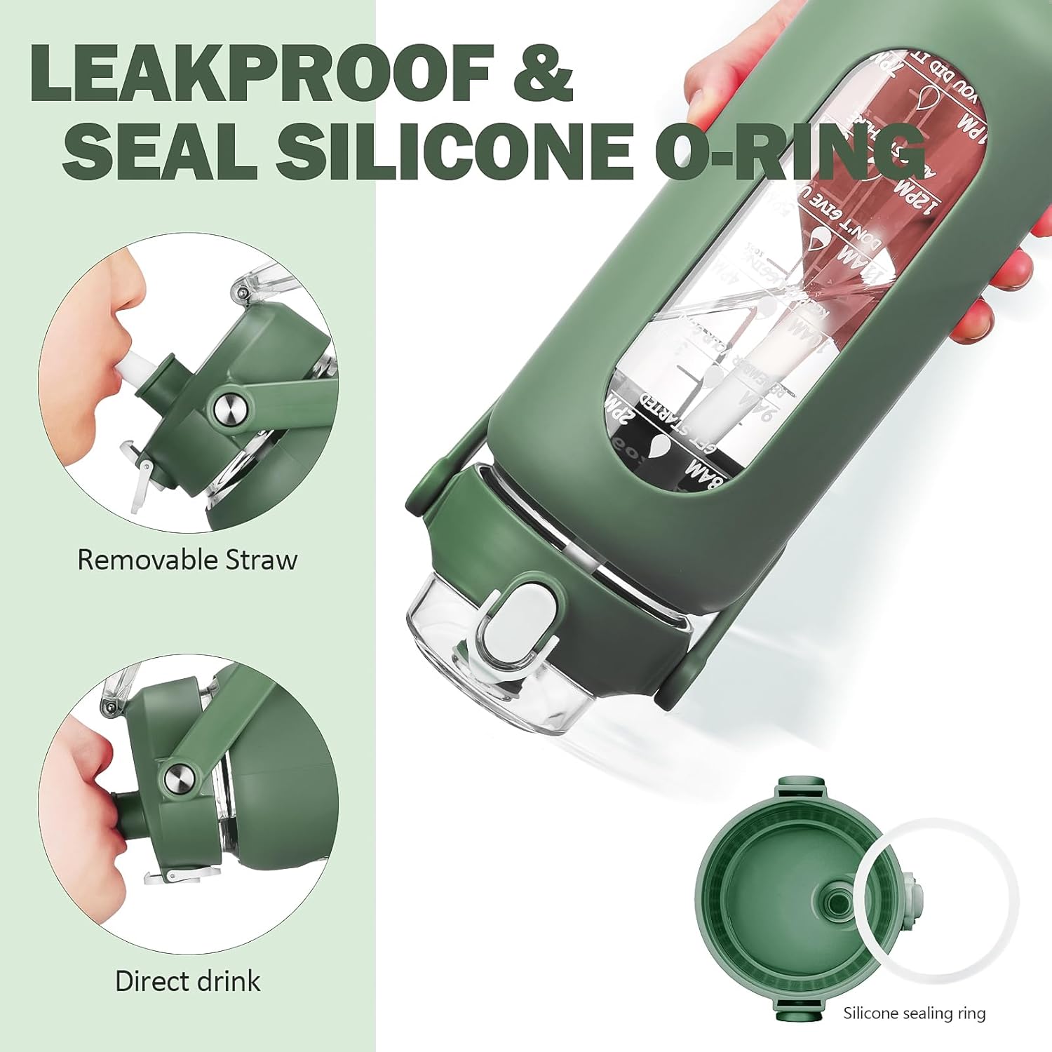 - ❤High-Quality Borosilicate Glass Bottle- This large motivationla water bottle is made of odorless, quality, borosilicate glass. Straw and lid are made of food-grade PP, BPA-free and eco-friendly.