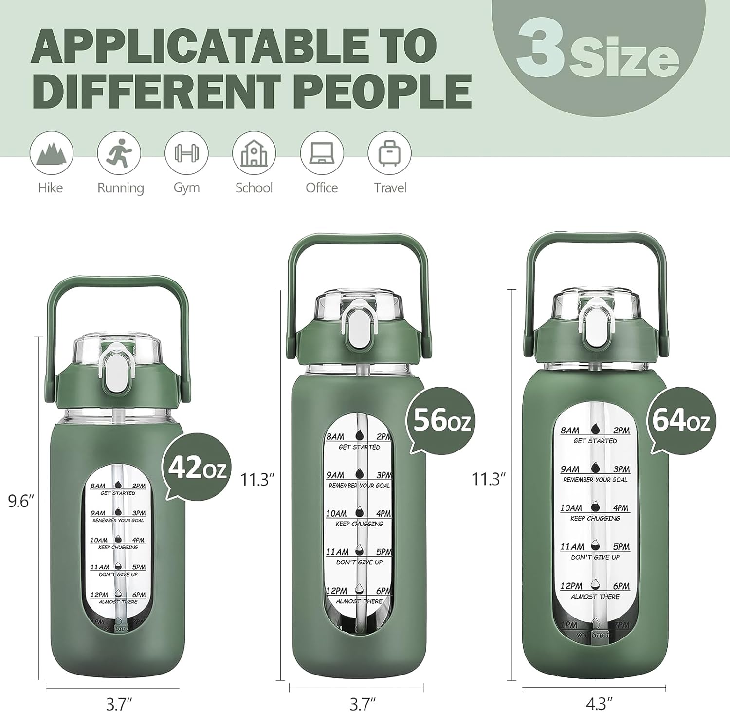 - ❤More Function- Our glass water bottle with stylish silicone sleeve which provides more grip and prevents the water bottle from slipping out. -This large motivational water bottle has a wide mouth, not only easy to hold ice cubes and fruit but also very easy to clean, you can use our complimentary cup brush to clean your water glass. -Handle on the lid for easy portability.