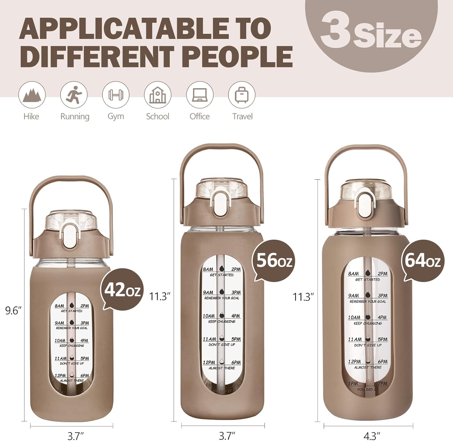 - ❤More Function- Our glass water bottle with stylish silicone sleeve which provides more grip and prevents the water bottle from slipping out. -This large motivational water bottle has a wide mouth, not only easy to hold ice cubes and fruit but also very easy to clean, you can use our complimentary cup brush to clean your water glass. -Handle on the lid for easy portability.