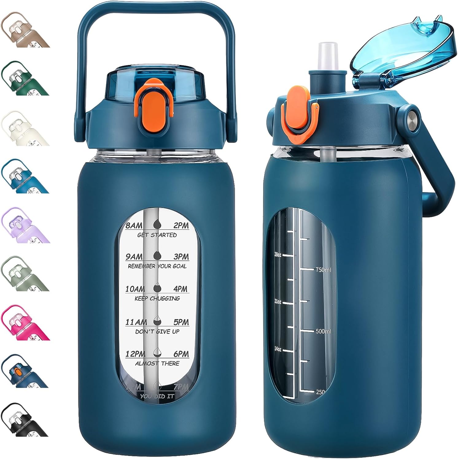 - ❤More Function- Our glass water bottle with stylish silicone sleeve which provides more grip and prevents the water bottle from slipping out. -This large motivational water bottle has a wide mouth, not only easy to hold ice cubes and fruit but also very easy to clean, you can use our complimentary cup brush to clean your water glass. -Handle on the lid for easy portability.