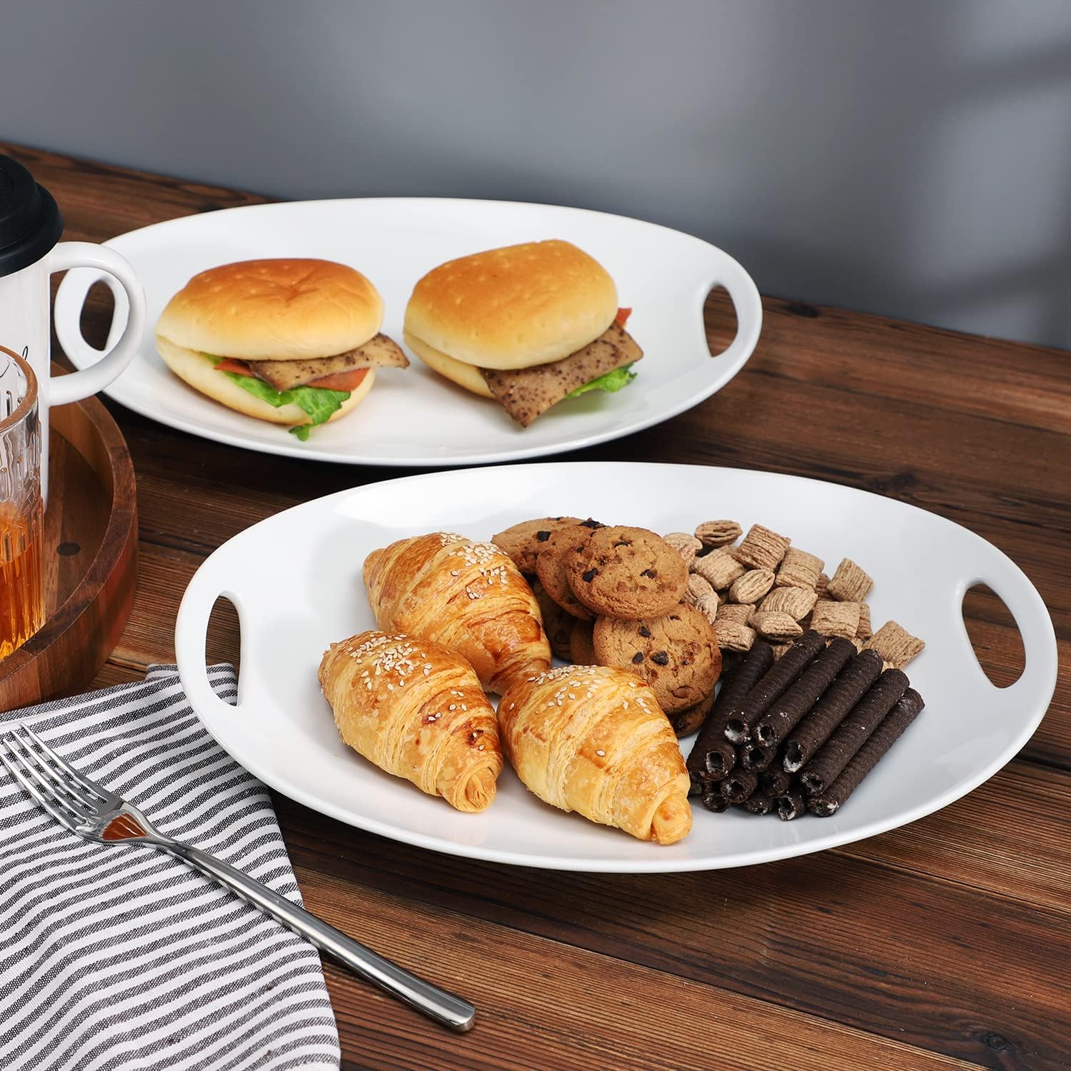 Porcelain Serving Platter with Handles, 14" serving dishes for entertaining, Oval Serving tray for Salad, Stew, Fruits and Pasta, Set of 2, White