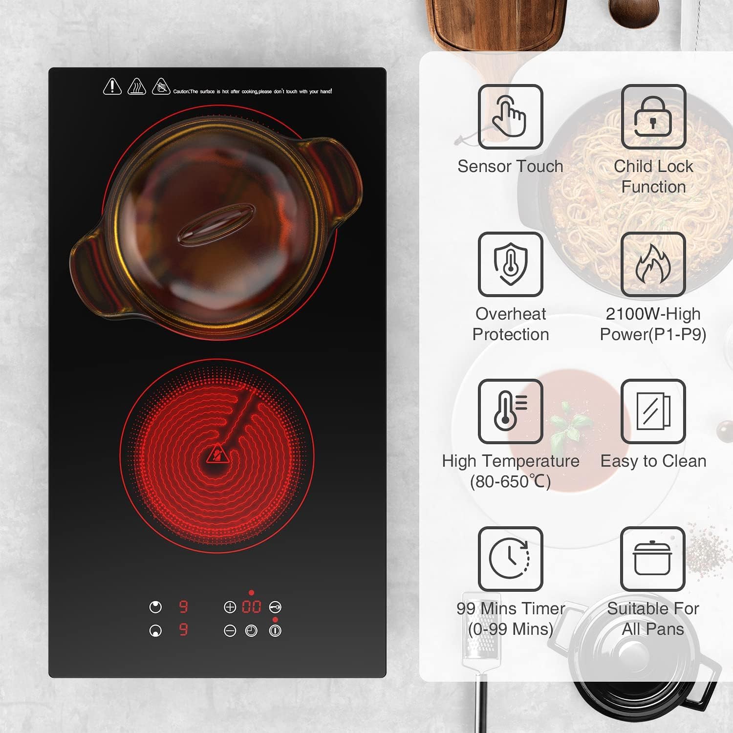 - Safety Induction Stove: The electric cooktop 2-burner is equipped with a child safety lock, timer, and overheat protection device, and the round edges are without sharp corners. Our 12" electric cooktop sets the timer from 1 minute to 120 minutes. The use of two upgraded low-noise cooling fans can greatly improve the heat dissipation effect. Safe and user-friendly