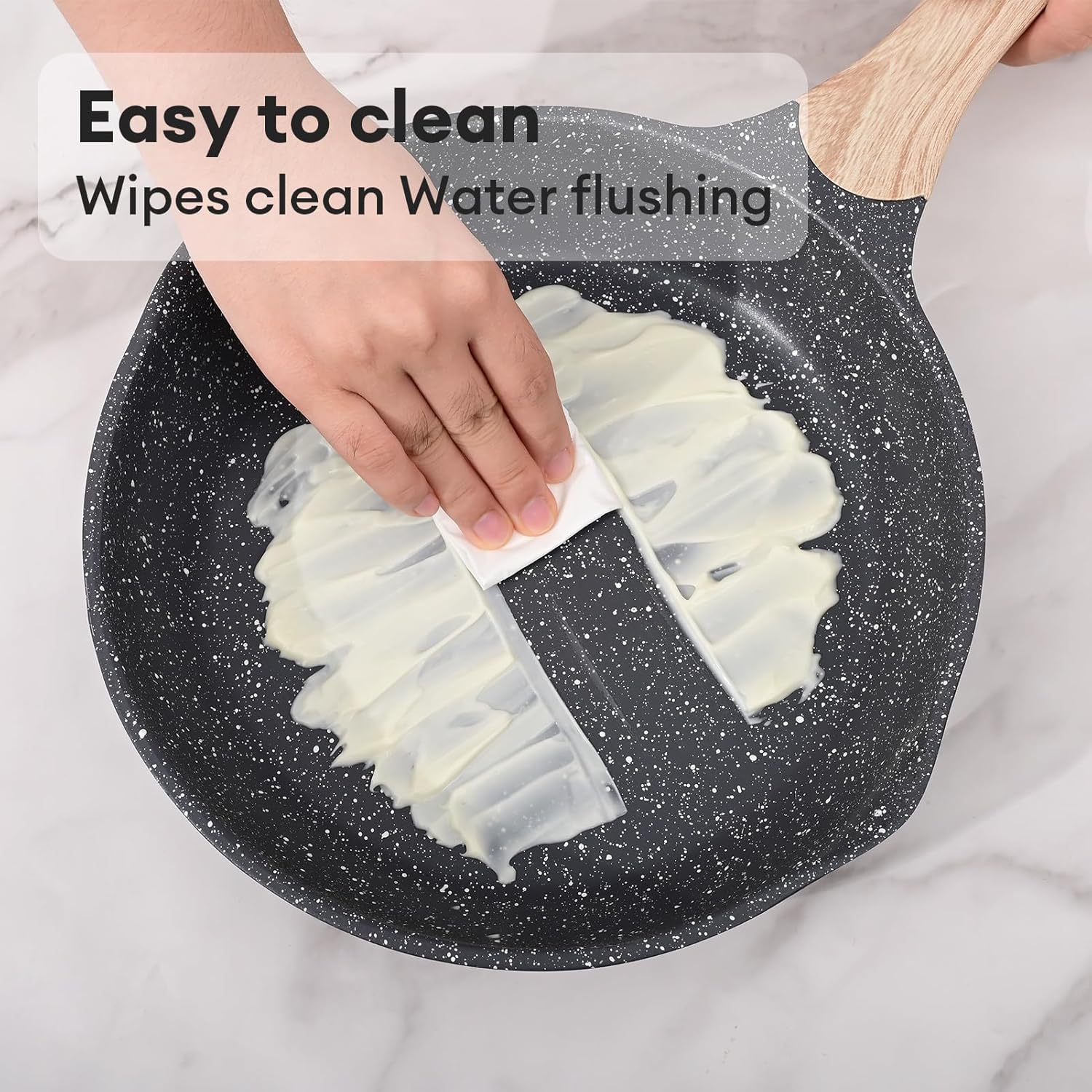 - 【Super Easy To Clean】Our non-stick frying pan cleans up in seconds, the eco-friendly coating makes cleaning a breeze, wipe it with a paper towel or rinse it with a little water. Hand washing is recommended to maintain coating longevity