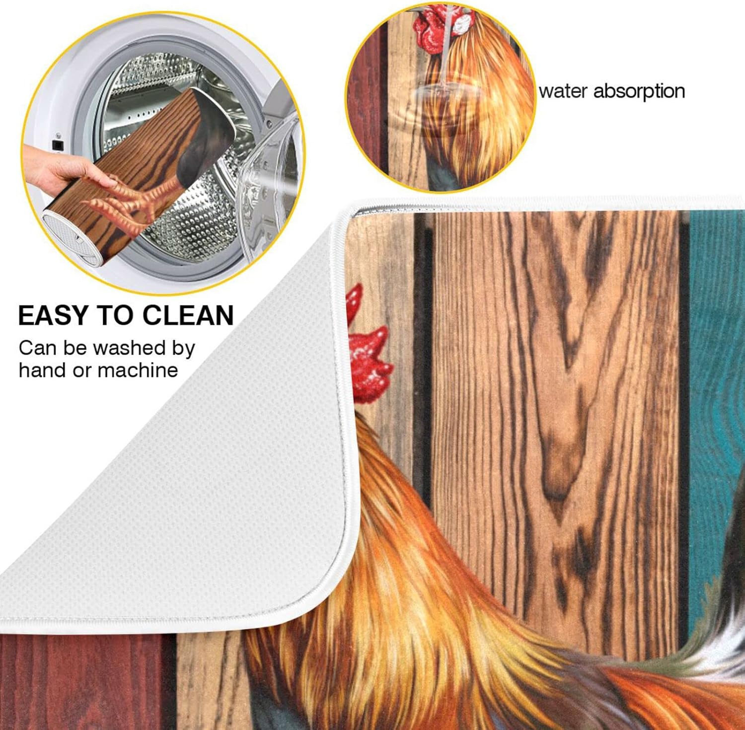 Rooster Dish Drying Mat for Kitchen Counter Farmhouse Absorbent Microfiber Drying Pad, Medium 16x18 in, Reversible Drainer Mats