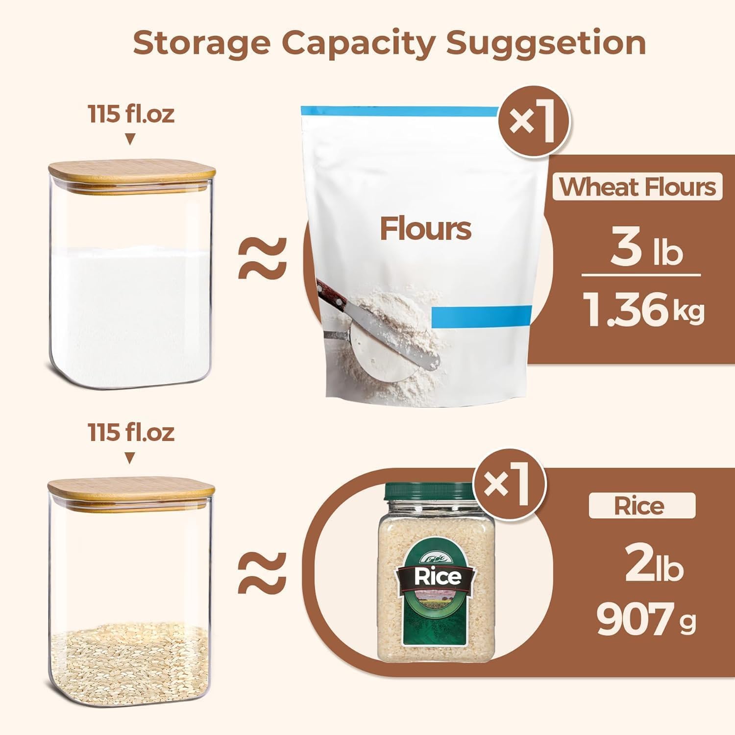 ComSaf 115 oz Glass Food Storage Containers, Cereal Storage Containers with Airtight Lids, Large Square Glass Jars with Bamboo Lids, for Rice, Pasta, Oats, Grains, Coffee Beans
