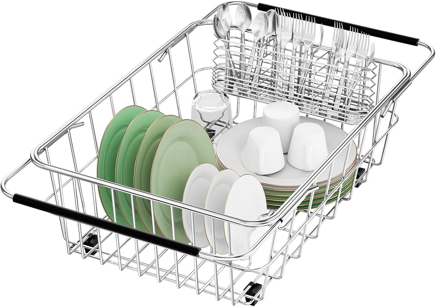 Large Sink Dish Drying Rack, Expandable 304 Stainless Steel Metal Dish Drainer Rack Organizer Shelves with Stainless Steel Utensil Holder Over Inside Sink, Rustproof