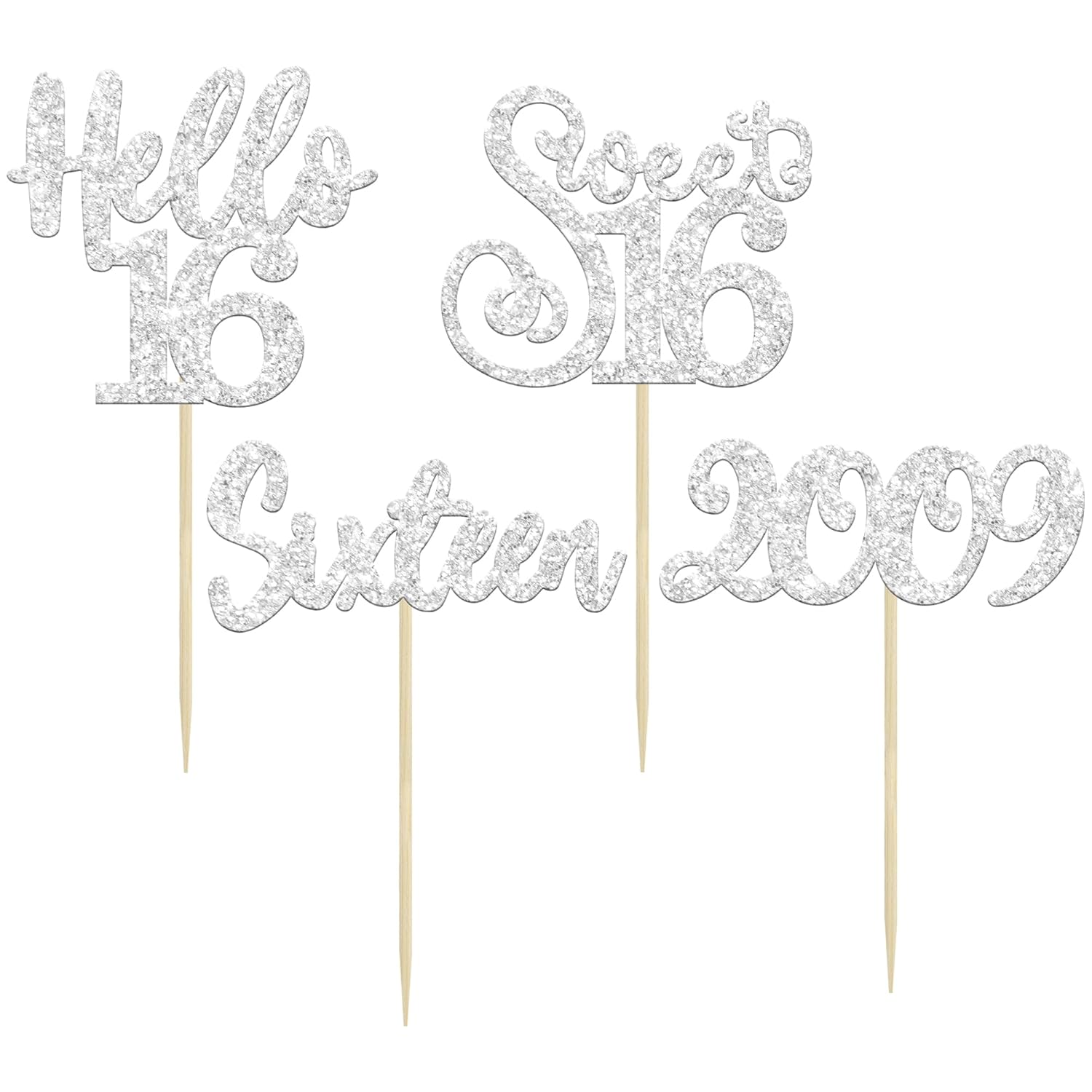 Gyufise 24Pcs 16th Birthday Cupcake Toppers Silver Glitter Hello 16 Sweet 16 Cupcake Picks 2009 16th Birthday Cake Decorations for Celebrating 16th Birthday Anniversary Party Supplies