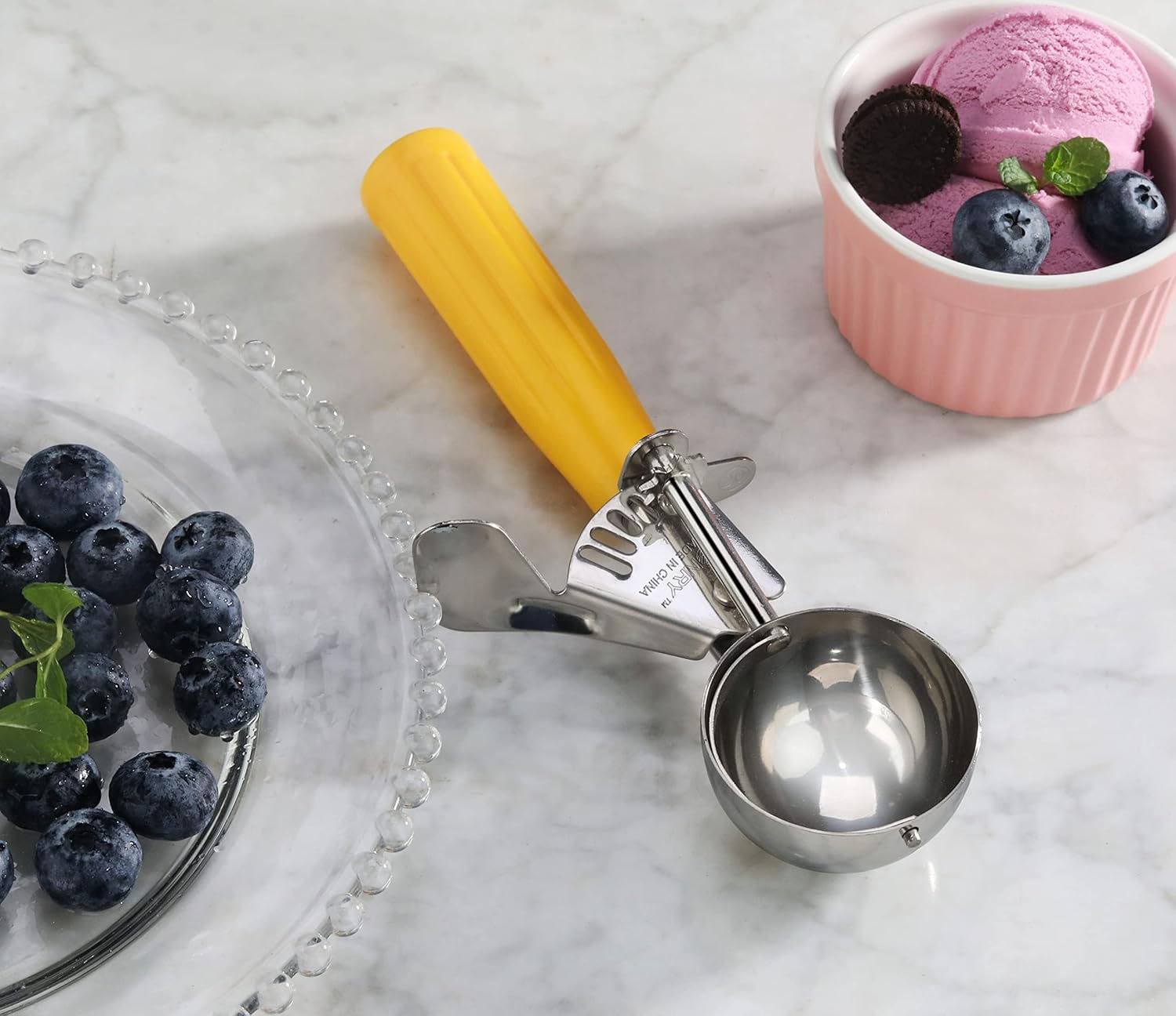 New Star Foodservice 537713 Commercial-Grade Thumb Press Food Disher/Ice Cream Scoop, 18/8 Stainless Steel, 2 oz, Size 20, Orange