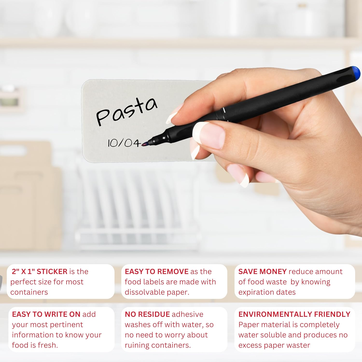 - Fully Dissolvable: These labels for food containers dissolve completely in water, whether in the dishwasher or under running water, leaving no sticky residue behind. They are perfect for labeling food containers or freezer storage and can be effortlessly removed after use.