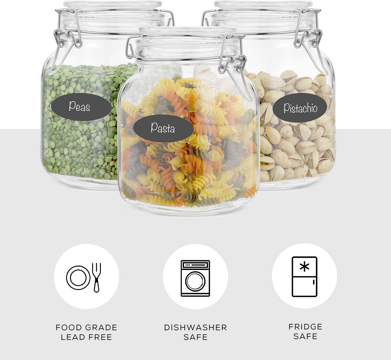 JoyJolt Airtight Glass Jars with Lids Set of 3. 32oz Glass Jar with Lid and 6 Silicone Seals! Med Glass Food Storage Containers. Square Mason Jar, Candy Jar, Sugar Jar, Pasta Containers for Pantry