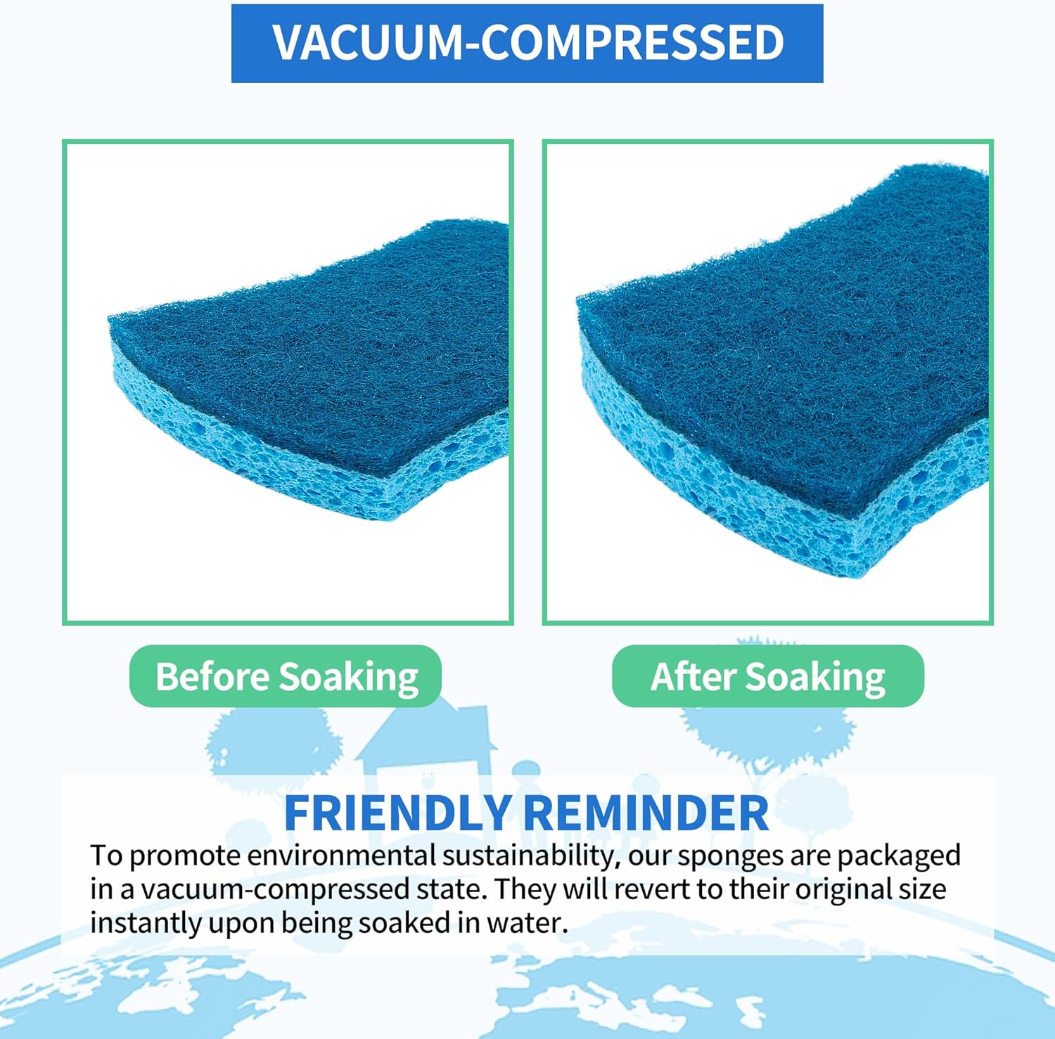 - Versatile and Efficient: Our sponges' unique double-side design ensures that it can be used efficiently. The sponge is soft enough for delicate surfaces like glass and non-stick cookware and also tough enough to remove stubborn stains and grime from countertops, sinks, and other surfaces. Plus, it can be used with just water or your favorite cleaning solution, making it a versatile tool in your cleaning arsenal.