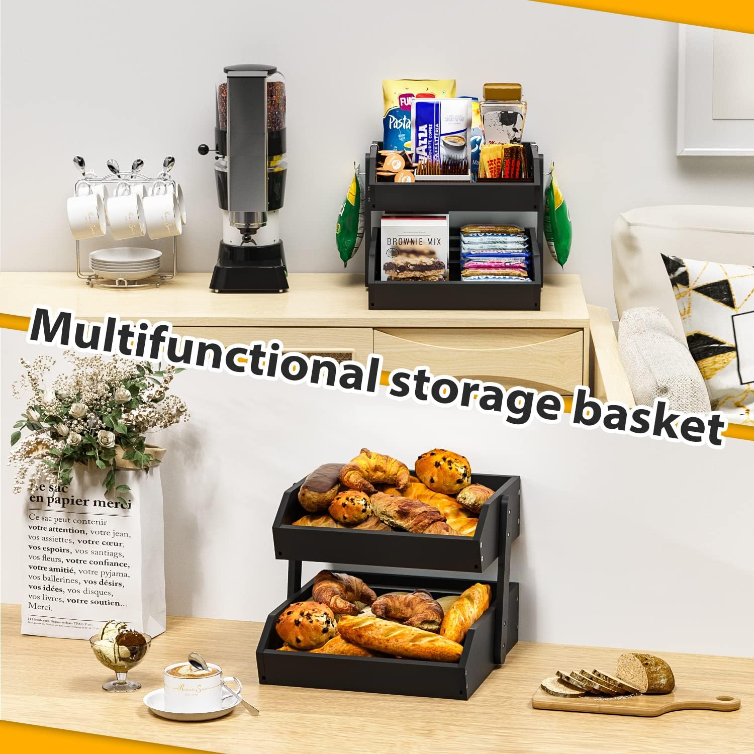 - MULTIPURPOSE STORAGE BASKET: The simple and stylish appearance and ample storage space are suitable no matter where it is placed. It can be a fruit stand, vegetable storage for kitchen; bread basket, spice rack on the countertop, or a snack storage rack in the bedroom(Self-assemble )
