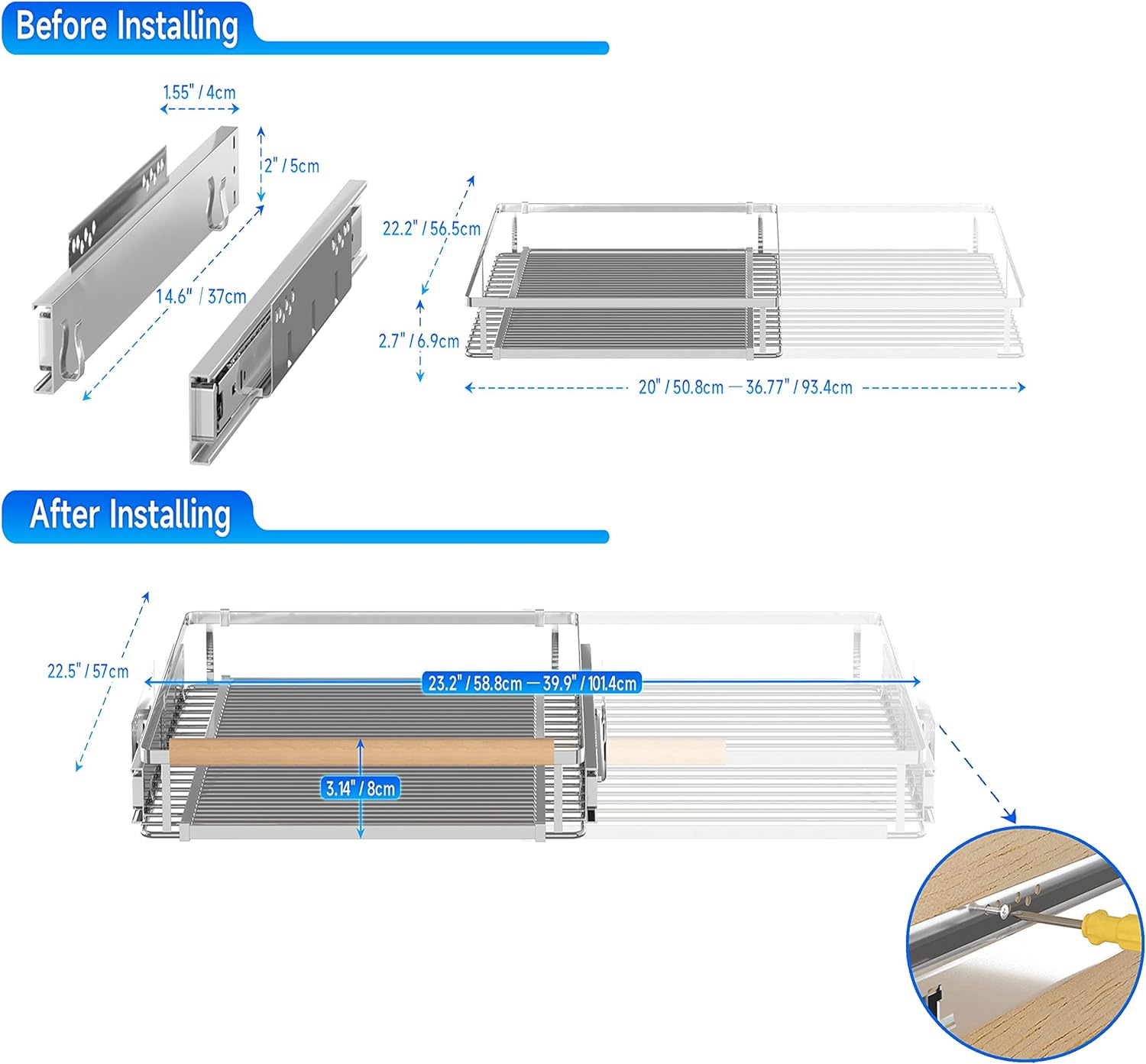 - ✔【Pull Out Drawers for Kitchen Cabinets with Adjustable Height】The improved slide out cabinet organizer is more flexible than the traditional pull out cabinet organizer; Its guide rail is installed on the side of the cabinet rather than the bottom of the cabinet; So it can be installed at any height; You can adjust the height of the installation basket according to your comfort; Note: Avoid the hinge of the cabinet during installation
