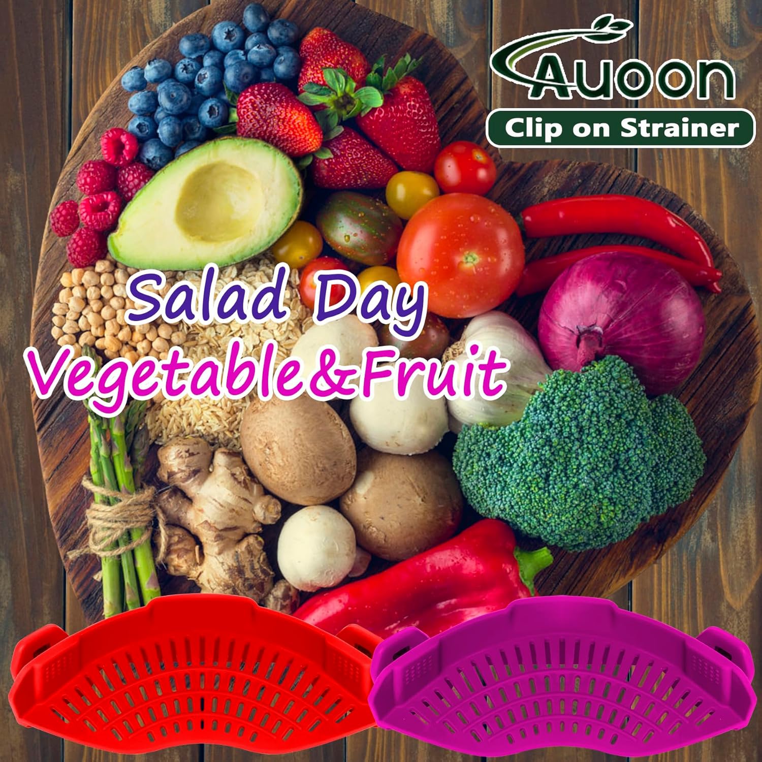 AUOON Clip On Strainer Silicone for All Pots and Pans, Pasta Strainer Clip on Food Strainer for Meat Vegetables Fruit Silicone Kitchen Colander (Purple)