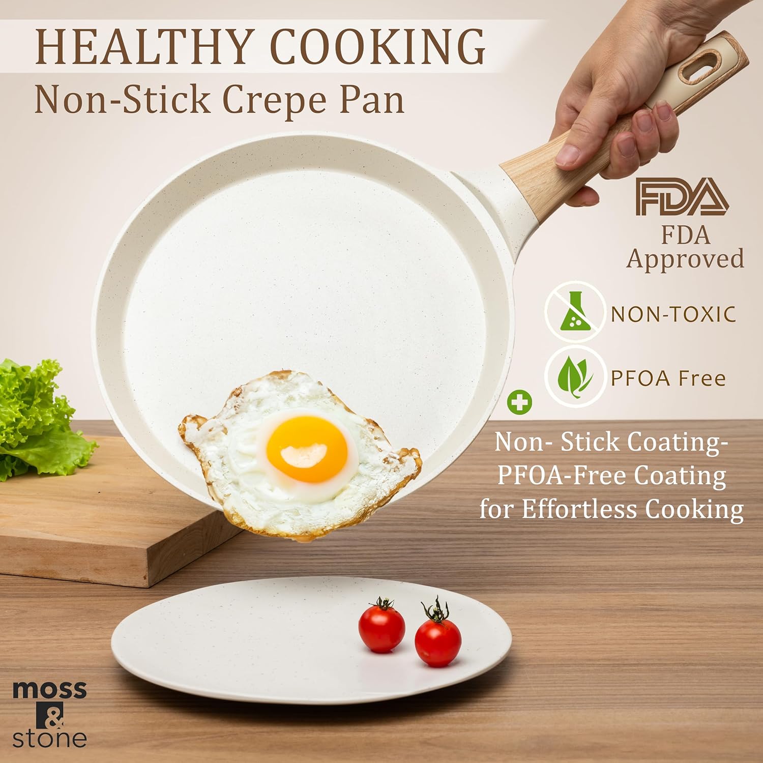 Moss & Stone 9.5 Inch Nonstick Crepe Pan with Spreader, Dosa Pan for Roti Dosa Tawa Comal Para Tortillas, Ceramic Flat Skillet Pan Induction Compatible, Pancake Pan for Stove Top - White