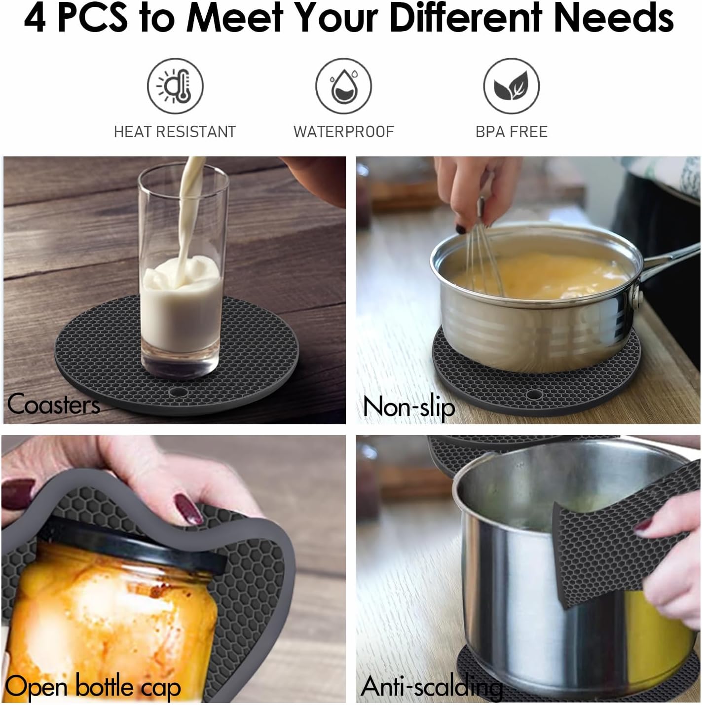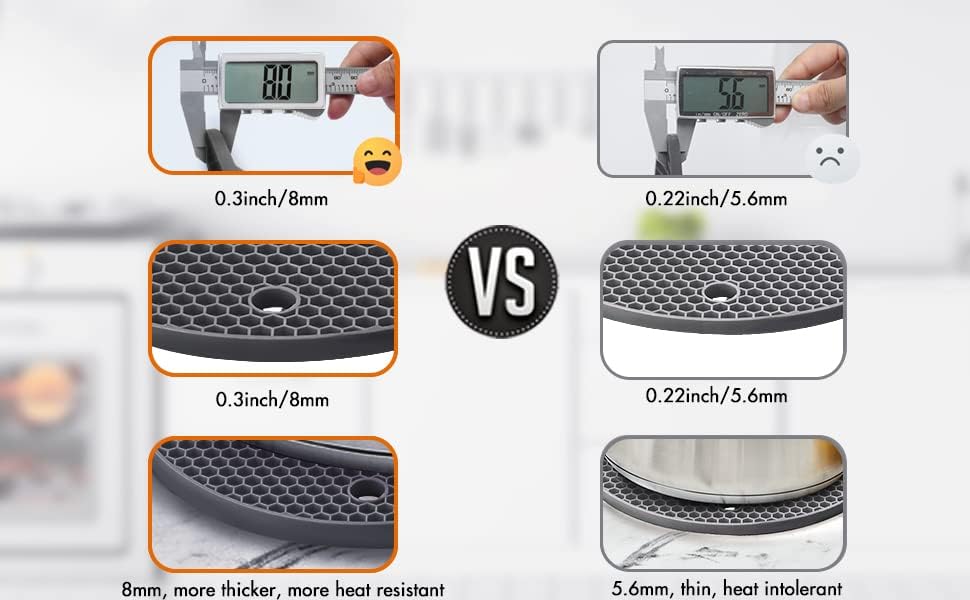 - 🎯【SMART DESIGN 】- Unique honeycomb designed silicone hot pads set takes over the water and with great texture prevent water droplets from the counter and anti-slip and also easy to dry by squeezing out or shaking And the honeycomb pattern not only decreases the weight, but also evenly distributes heat and offers a firm grip while.