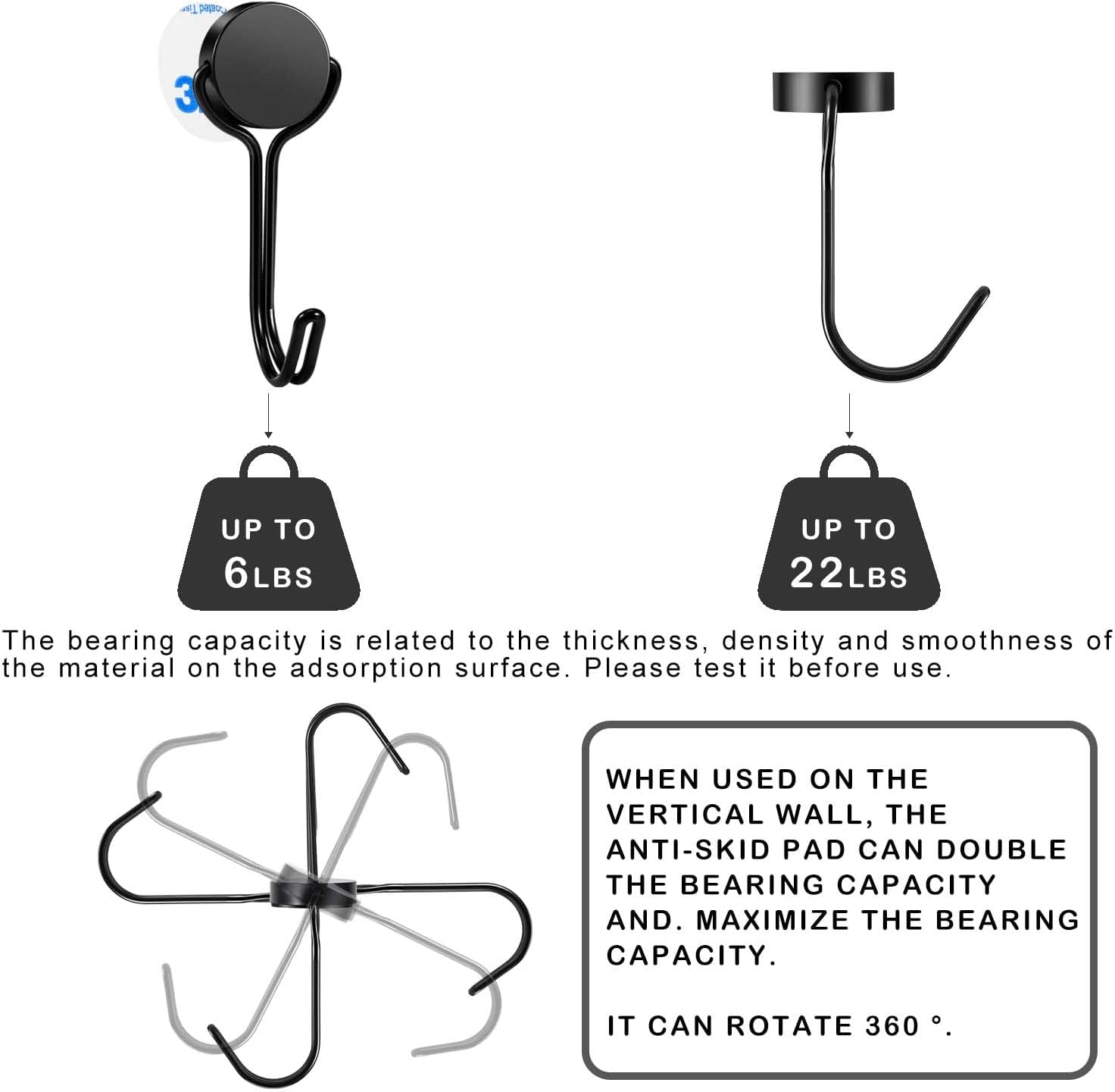 - 【Equipped with Non-slip Pad】Using with anti-slip pads which enables magnetic hook to bear more weight when use horizontally, such as refrigerators and iron doors, the load-bearing capacity can be double, so no need to worry about items slipping off. The maximum load capacity is 22LBS for horizontal walls and 6LBS for vertical walls.