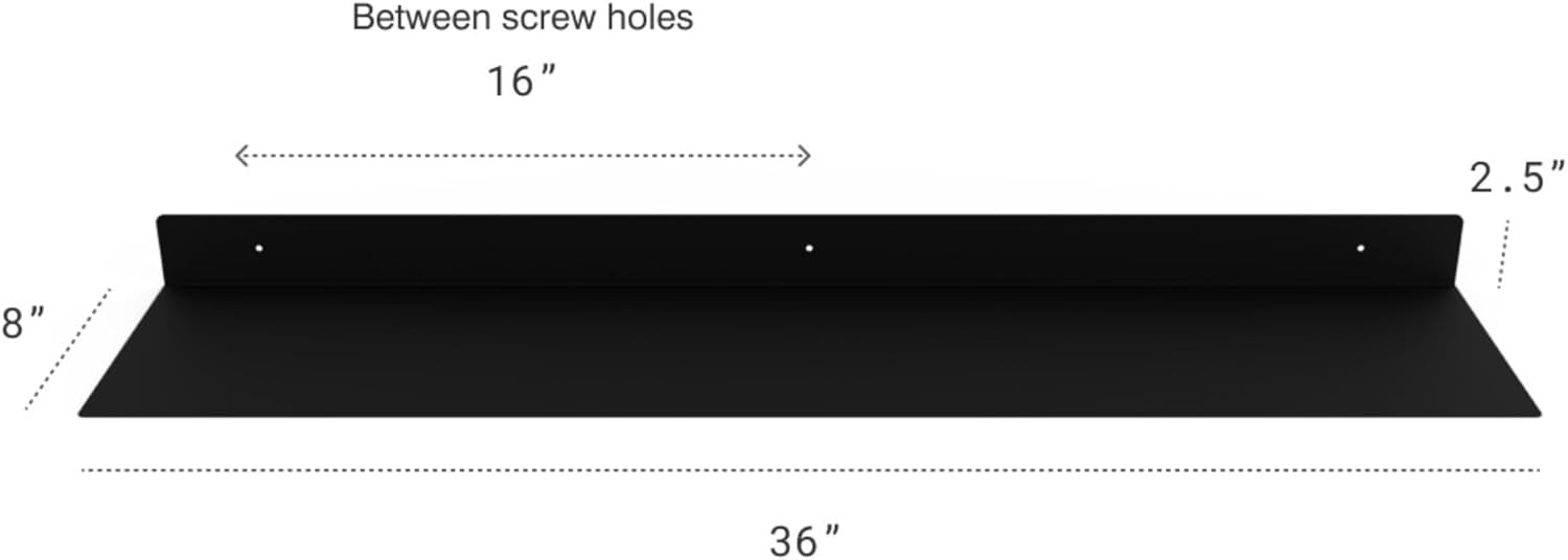 - DIMENSIONS & DETAILS: Measuring 36-inches long x 8-inches in depth, our steel floating shelf is made from 14 gauge raw steel and professionally powder coated matte black. The weight of the shelf is 8 LBS. It's perfect for displaying books, plants, bottles, picture ledges, and retail displays