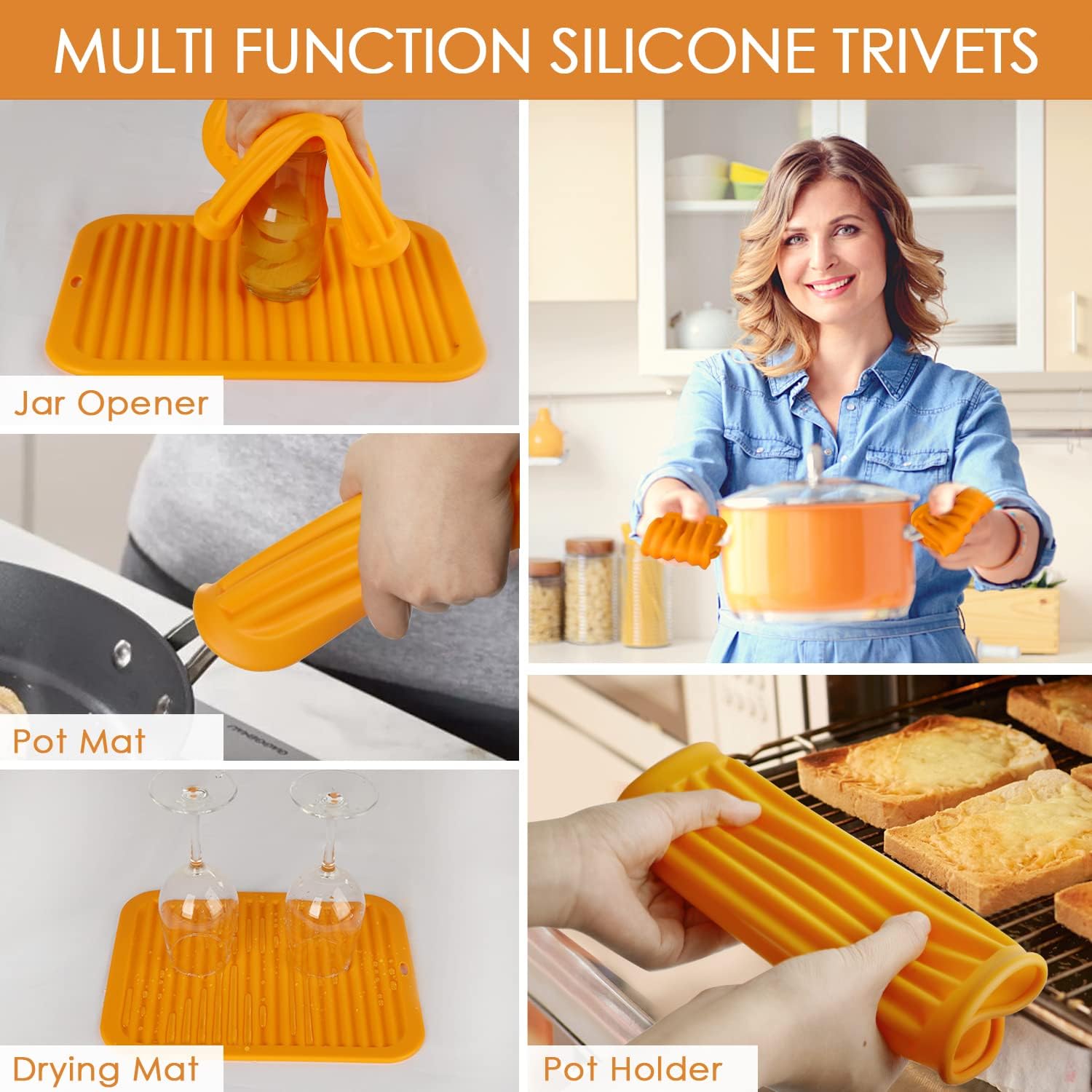- 🍳【VERSATILE KITCHEN TRIVETS】: It is perfect as a silicone hot pad or anything in the kitchen that needs a silicone pad. One orange silicone mat replaces at least four kitchen gadgets. We can use the large silicone trivet mat for hot pots as a potholder, hot pot holder, small dish drying mat, silicone placemat, jar opener, coffee maker mat, garlic peeler, or teapot mat for other kitchen utensils.