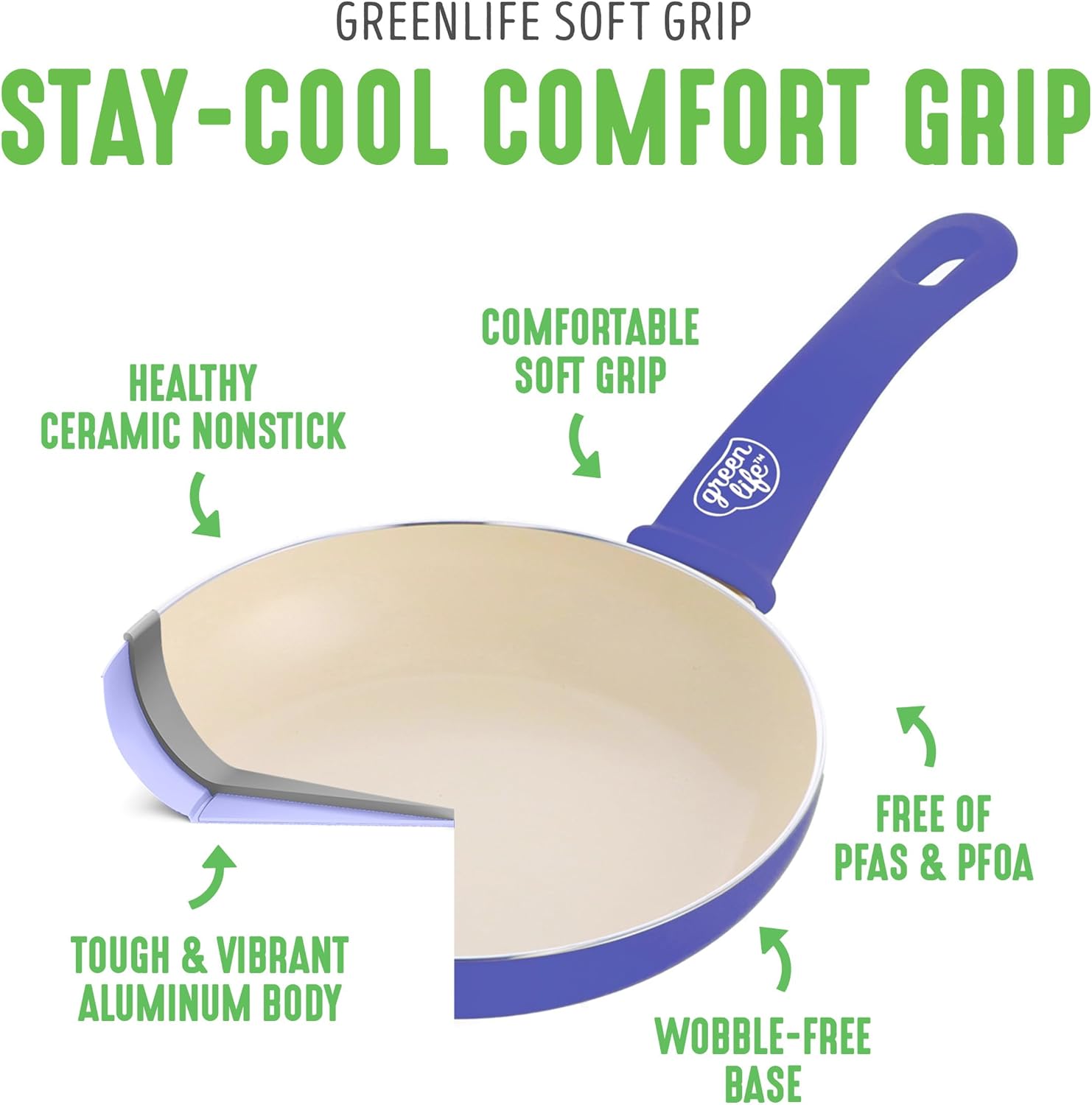 GreenLife 16 Piece Nonstick Cookware Set, Soft Grip Non-Toxic PFAS-Free Ceramic Pots & Pans, Dishwasher & Oven Safe, Frying, Sauce, Utensils, Glass Lids, Stay-Cool Handles, Wobble Free, Periwinkle