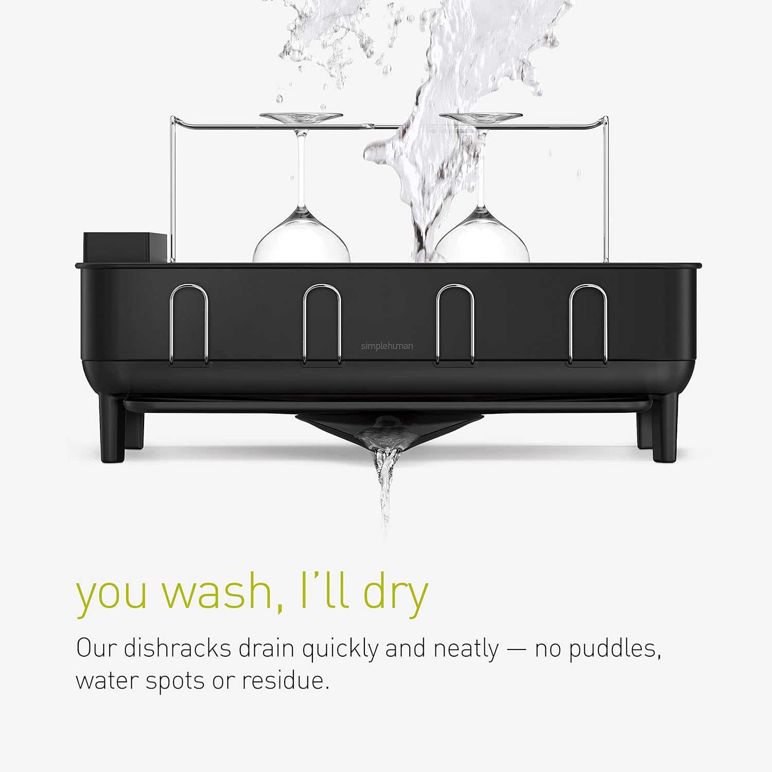 simplehuman Large Capacity Dish Drying Rack with Stainless Steel Frame, 360º Easy Drain Swivel Spout, Utensil & Wine Glass Holder, Anti-Residue Coating, Moisture Control Surface, Matte Black