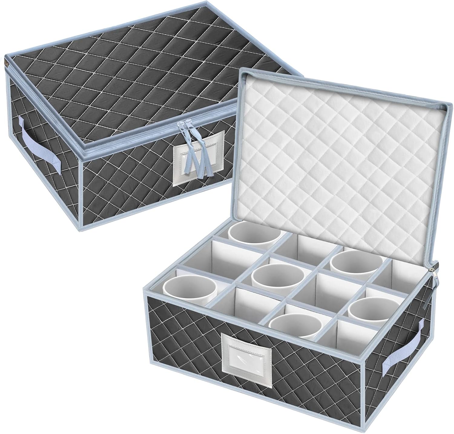 VERONLY Mug and Cup Storage Box with Dividers - 2 Pack China Storage Bin Containers Holds 24 Glassware, Stackable Coffee Mug Organizer Bin and Tea Cup with 2 Metal Zipper,Label and Handles (Grey)