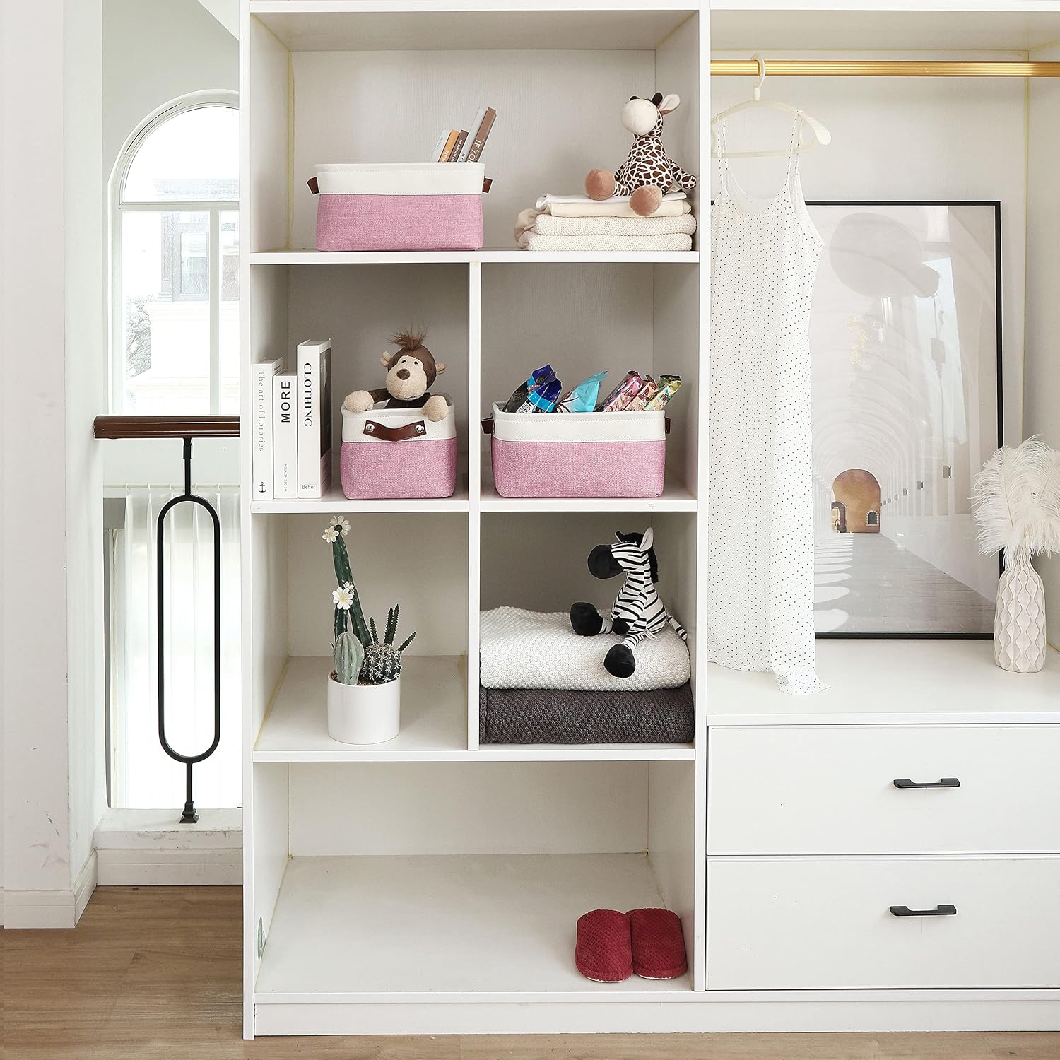OrganiHaus Small Fabric Storage Baskets for Shelves 3 Pack, 12x8in Closet Storage Bins for Shelves, Cloth Baskets for Organizing, Linen Closet Organizers, Fabric Basket, Pink/White