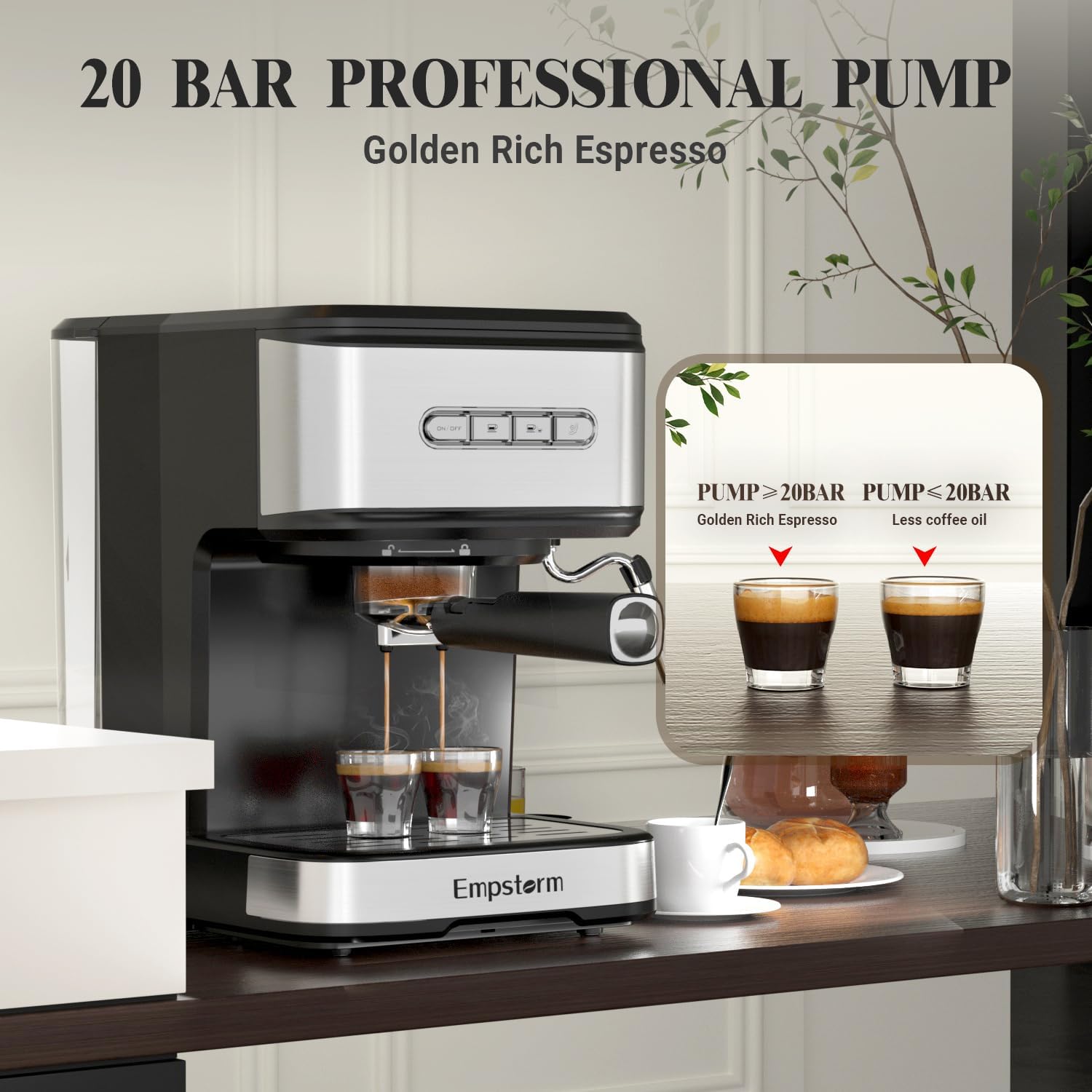 - 𝐁𝐚𝐫𝐢𝐬𝐭𝐚-𝐆𝐫𝐚𝐝𝐞 𝟐𝟎𝐁𝐚𝐫 𝐏𝐔𝐌𝐏 𝐏𝐄𝐑𝐅𝐎𝐑𝐌𝐀𝐍𝐂𝐄:Experience authentic Italian espresso extraction with our 20Bar Electromagnetic Pressure Water Pump, engineered to unlock beans’ full flavor potential. This stainless steel coffee maker generates rich crema and intense aromas like a café-grade system. The double-layer stainless steel filter ensures uniform water dispersion, while corrosion-resistant construction withstands daily Home & Café Use – perfect for both beginners and connoisseurs seeking professional results