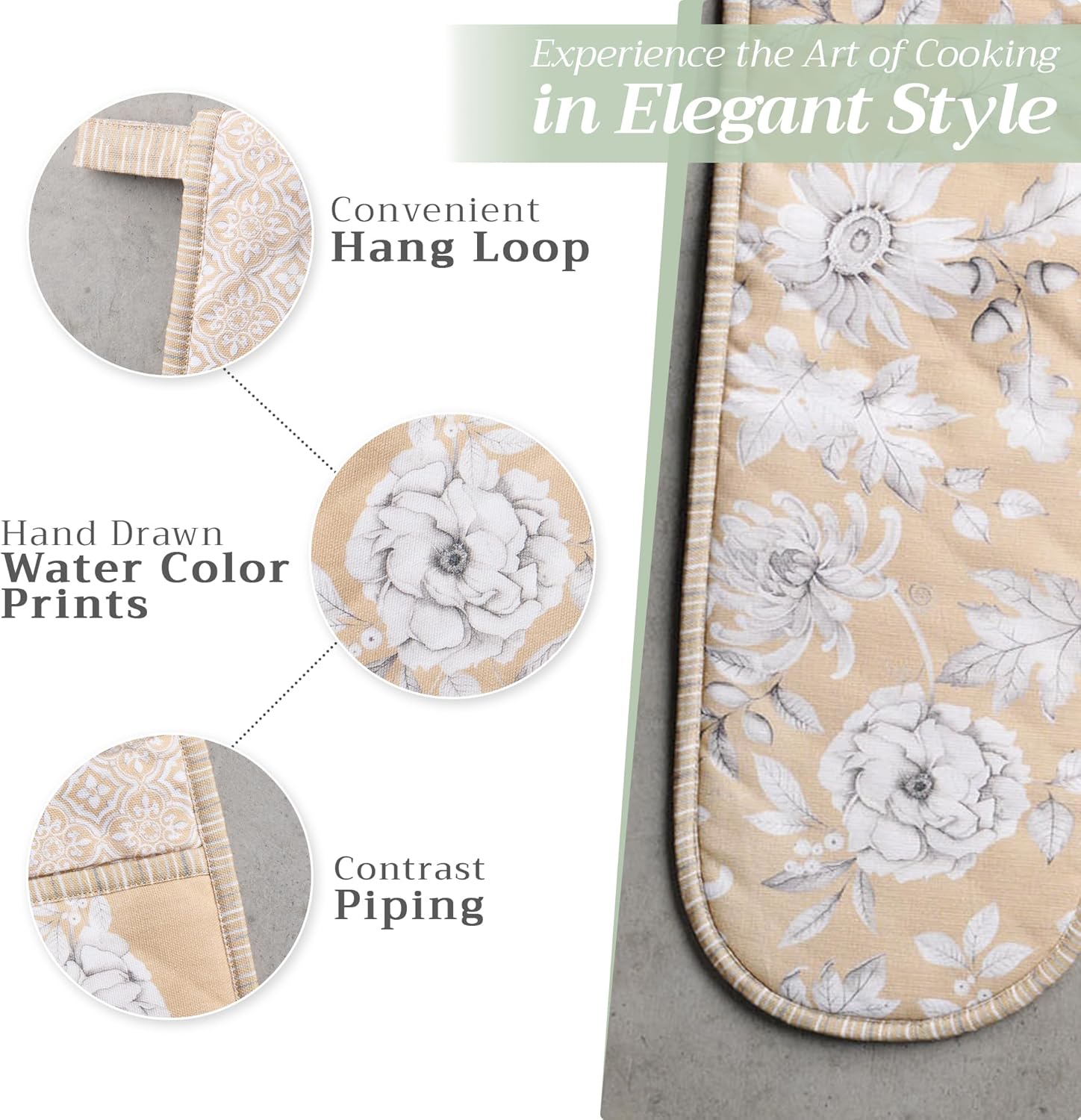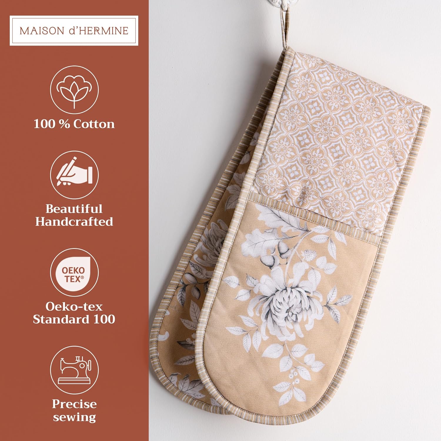- Package includes: Includes 1 double oven mitt sized 7"x35". Perfect for handling hot cookware safely while adding a touch of European elegance to your kitchen. Designed in Europe and made in India with care