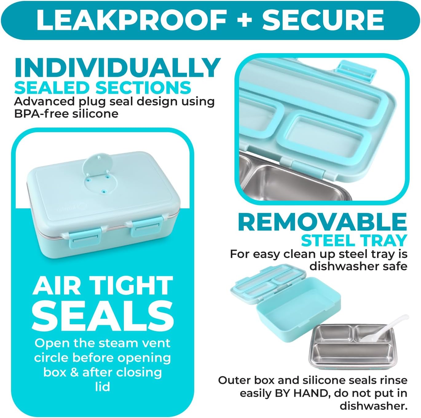 - Heavy-Duty LEAKPROOF Container – Along with a sturdy spill-proof design and easy-open latches for small hands these bento boxes for kids lunches are insulated in the lid with an AIR RELEASE CIRCLE. Open this FIRST, before the lid and then close after the lid is shut for a secure seal. You will HEAR THE AIR releasing when opening and closing properly - this confirms it is air tight.