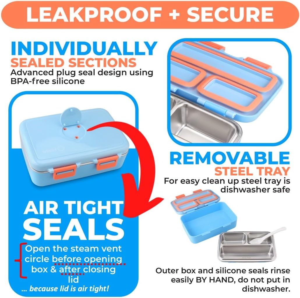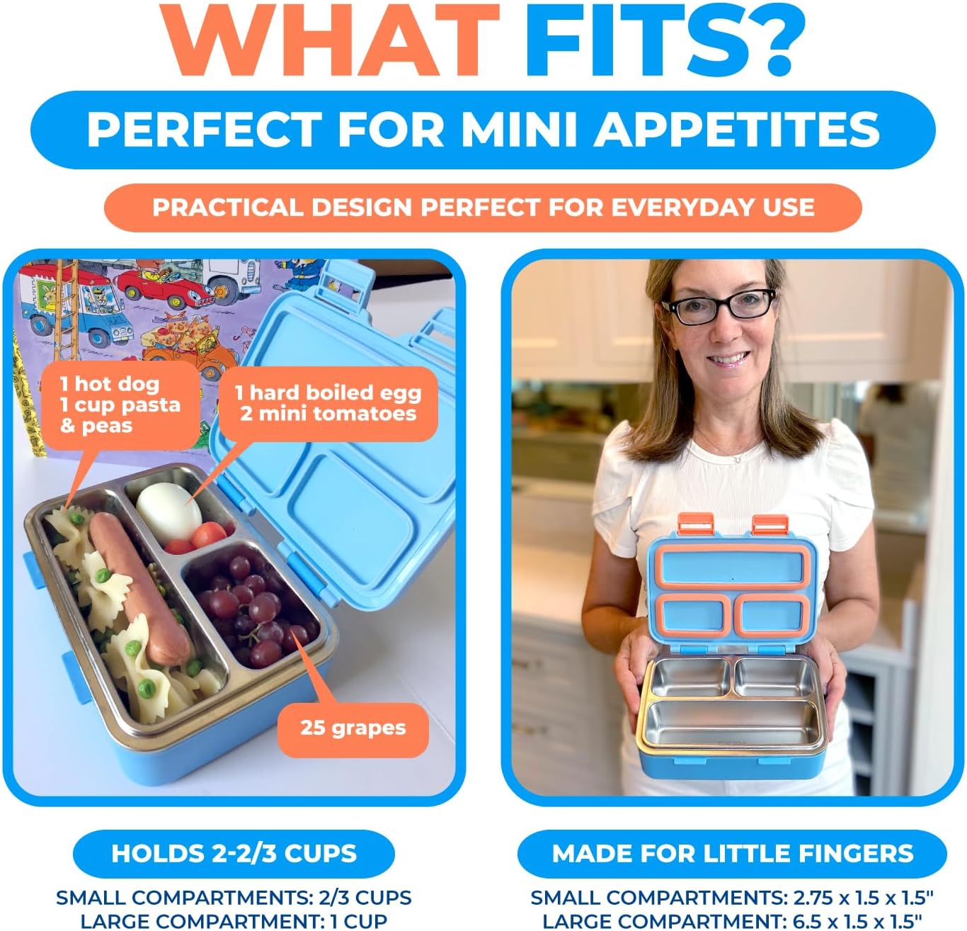 - New Upgraded Features! PREMIUM MINI Steel Bento Box – A fun way to send your toddlers, baby and young children to daycare or preschool with a healthy lunch. This travel-friendly lunch box features 3 stainless steel section compartments sealed individually with high-grade silicone seals to keep food fresh. Includes spork. BPA and phthalate free. AGE 3+