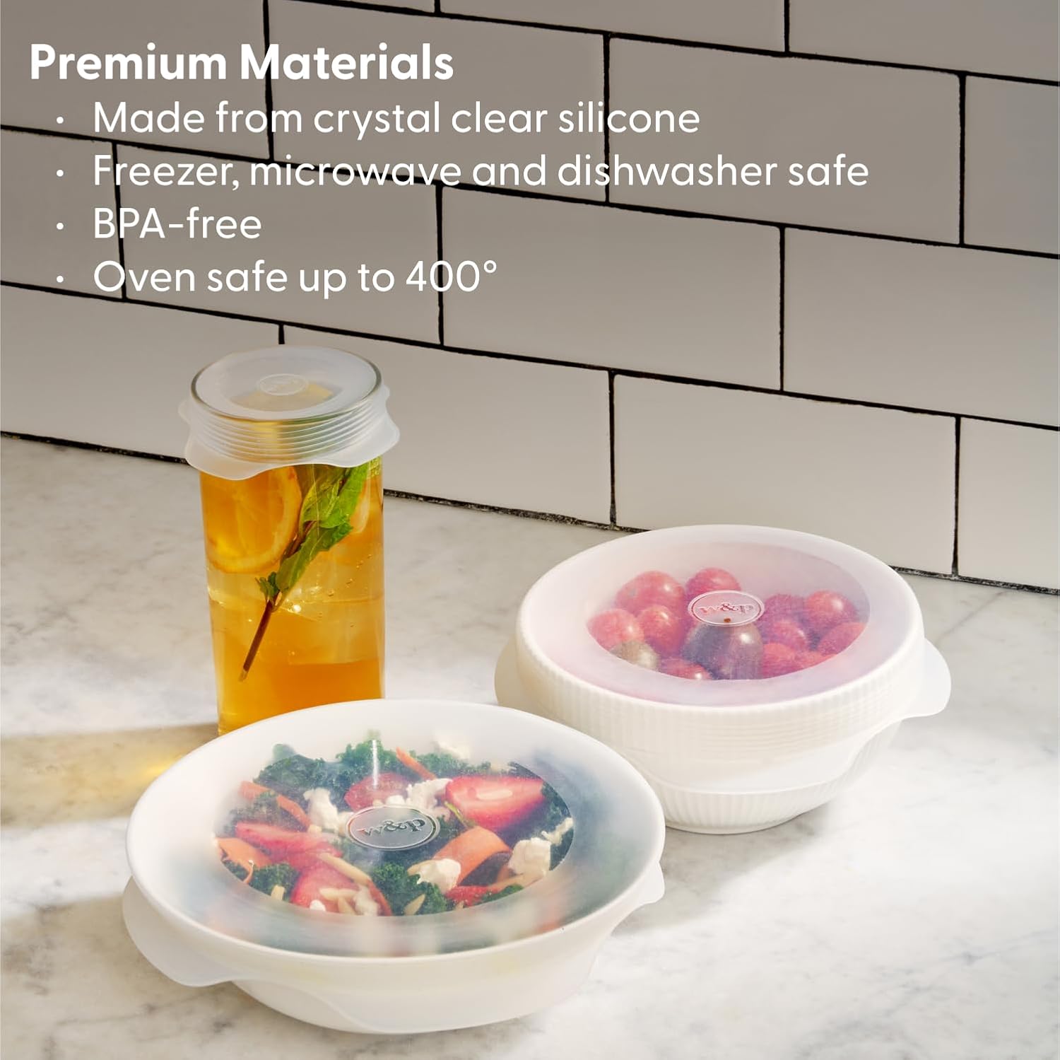 - PREMIUM MATERIALS: Lids are made from super stretchy and crystal clear silicone that is freezer safe, dishwasher safe, BPA free, microwave safe, and even oven safe up to 400º