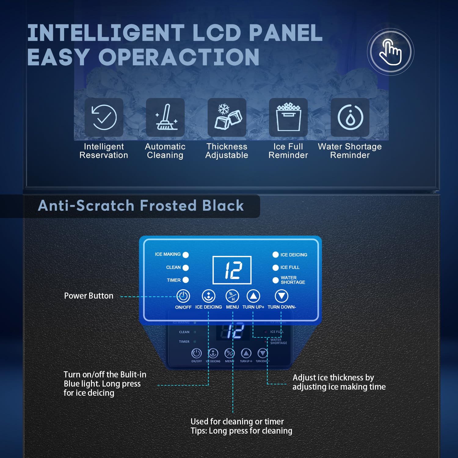 - πππππ-π πππππππππ πππππππππππ πππ πππππππ πππππ - All the functions of the ice cube maker can be solved with one click through the LCD panelοΌ24-hour reservation function, automatic self-cleaning function, de-icing function, built-in blue light, malfunction reminders (indicators). Press the (+) or (-) button to adjust the ice making time, thus adjusting the ice size to meet different ice needs