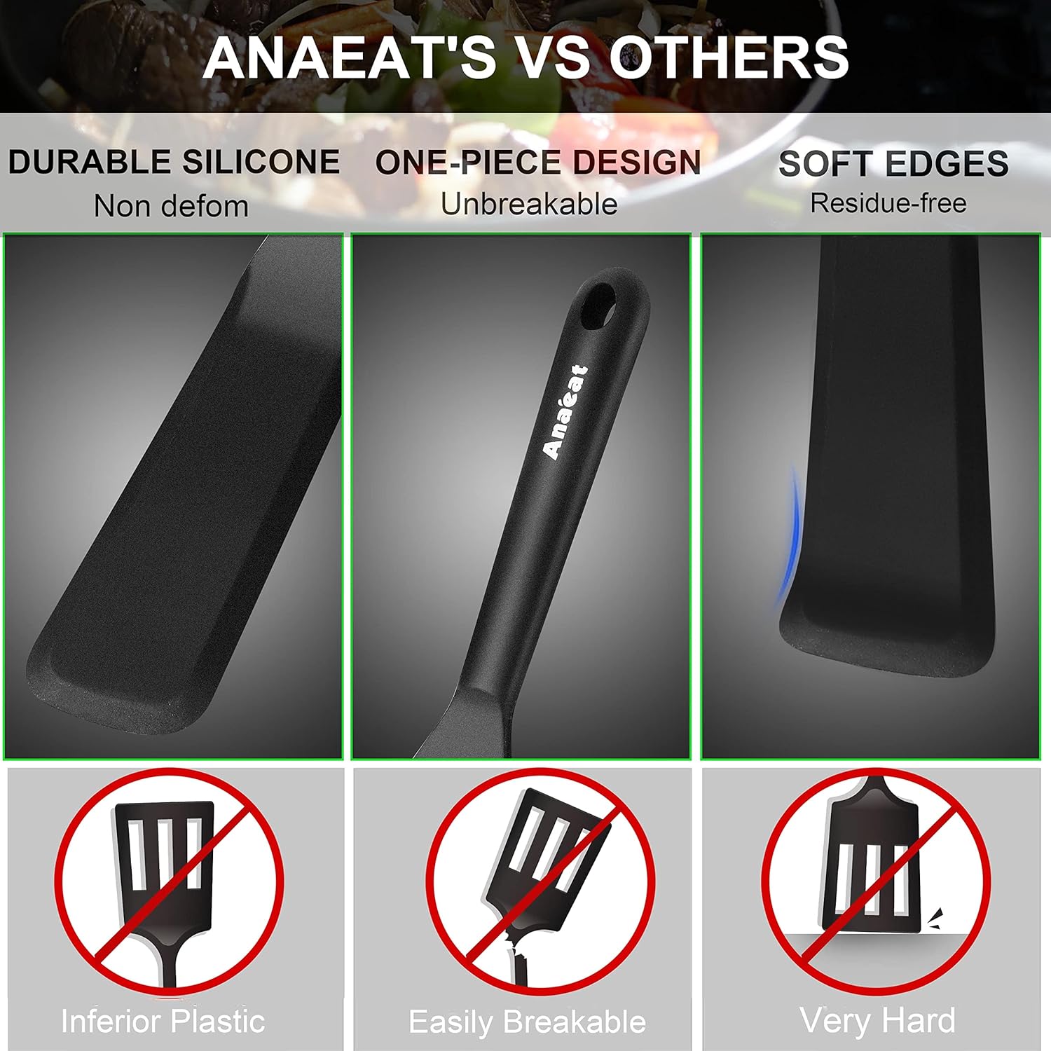- BRAND QUALITY GUARANTEE - QUALITY CAN SPEAK ITSELF. Anaeat focuses on kitchenware research and development. We are so confident that we have the best silicone thin spatulas on the market. If you have any problems with Anaeat products, feel free to send us a message by Amazon and we resend to you right away for free, or full money back. We are very concerned about every order, and try our best to Provide our customers with HEALTHY & DURABLE kitchen accessories.