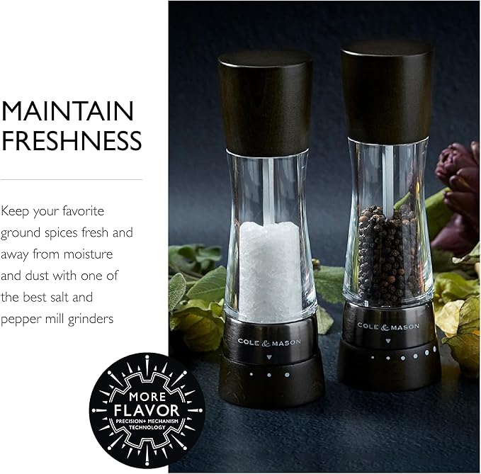 Cole & Mason H332293 Derwent Black Wood Salt and Pepper Mills, Gourmet Precision+, Adjustable Grind, Stained Beech/Acrylic, 190 mm, Gift Set, Includes 1 Salt and 1 Pepper Grinders