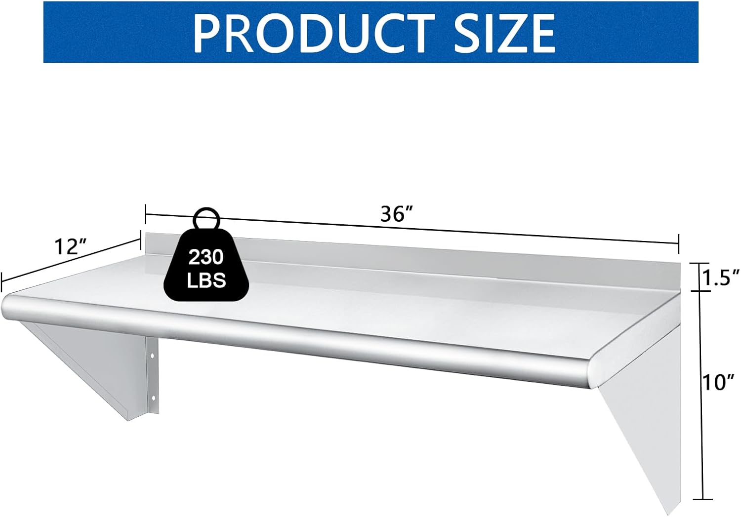 - 【STURDY STRUCTURE】- The stainless steel floating shelf has a remarkable weight capacity of 230lbs, The size is 12 "W x 36" L. Two triangular brackets are designed below the shelf to enhance the stability and distribute weight evenly, it provides enough storage space for spices, kitchen appliances, microwave ovens, allowing you to place products at a glance.